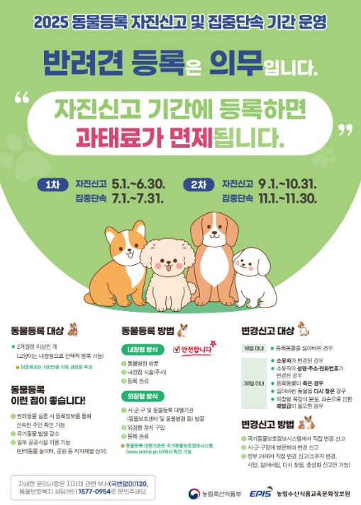 영주시는 반려동물 소유자의 책임 있는 반려문화 정착을 위해 오는 6월 30일까지 ‘동물등록 자진신고 기간’을 운영한다고 밝혔다.동물등록제는 유실·유기동물 발생을 예방하고, 반려동물 복지 정책의 기초자료로 활용하기 위해 반려동물 정보를 시·군·구에 등록하는 제도다. 생후 2개월 이상 반려견의 소유자는 반드시 등록을 해야 하며, 등록 이후 주소나 연락처 등의 정보가 변경되면 그 내용을 반드시 반영해야 한다.주소나 연락처 변경은 국가동물보호정보시스템을 통해 온라인으로 간편하게 수정할 수 있으며, 소유자가 변경된 경우에는 정부24 또는 영주시청 축산과를 통해 직접 신고해야 한다.현행 법령에 따르면 반려견을 등록하지 않거나, 등록 후 변동사항을 신고하지 않을 경우 최대 60만 원 이하의 과태료가 부과된다. 그러나 영주시는 이번 자진신고 기간 동안 신규 등록 또는 변경 신고를 완료한 시민에 한해 과태료를 면제할 방침이다.동물등록은 동물등록 대행 동물병원을 직접 방문해 내장형 무선식별장치(RFID)를 시술받는 방식으로 진행되며, 등록 대행 병원 현황은 영주시청 축산과로 문의하면 안내받을 수 있다.시는 등록 활성화를 위해 등록 시술비 전액을 지원하는 ‘반려동물 등록 지원사업’을 함께 추진하고 있으며, 해당 사업은 5월 23일까지 주소지 읍·면·동 행정복지센터에서 신청할 수 있다. 이를 통해 시는 등록률을 높이고, 보다 체계적인 반려동물 관리 기반을 마련할 계획이다.또한, 시는 자진신고 기간 이후인 7월 한 달 동안 반려견 출입이 많은 공원과 산책로 등을 중심으로 집중 단속을 실시할 예정이다. 단속 대상은 △미등록 반려동물 △변경사항 미신고 △목줄 길이(2m 이내 유지) 위반 등이다.시 관계자는 “동물등록은 반려동물과 함께하는 문화가 올바르게 정착되기 위한 가장 기본적이고 중요한 절차”라며, “영주시민 누구나 무료로 등록할 수 있는 기회인 만큼, 반려동물을 키우는 시민 여러분의 적극적인 참여를 바란다”고 말했다.