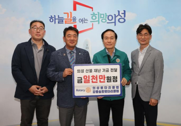 의성군은 의성로타리클럽과 강릉솔향로타리클럽이 지난 13일 최근 대형 산불로 큰 피해를 입은 의성군의 복구를 돕기 위해 성금 1,000만원을 군에 기탁했다고 밝혔다. 이날 기탁식에는 김주수 의성군수를 비롯해 의성로타리클럽 배진수 회장과 임원들이 참석한 가운데 진행됐으며, 기탁된 성금은 산불로 삶의 터전을 잃은 이재민들의 생활 안정과 피해 복구를 위한 다양한 지원 사업에 사용될 예정이다. 배진수 회장은 “산불로 인해 몸과 마음이 지친 주민들이 조금이나마 안정을 찾을 수 있도록 조그마한 성금을 모았다”라며 “앞으로도 지역사회와 함께하는 의성로타리클럽이 되겠다”라고 밝혔다. 한편, 의성로타리클럽은 이번 산불 피해 구호를 위해 김밥과 의류, 마스크 및 봉사 차량을 지원하는 등 지역사회가 어려울 때 적극적으로 나눔 활동을 실천하고 있으며, 이번 기탁 역시 강릉솔향로타리클럽과 함께 작은 도움이 되고자 하는 회원들의 마음을 담은 것으로 알려졌다. 김주수 의성군수는“오랜 시간 동안 지역사회와 함께하며 따뜻한 손길을 보내주신 의성로타리클럽에 깊이 감사드린다”라며 “이 성금이 산불 피해 주민의 빠른 일상 회복과 실질적인 지원에 큰 도움이 될 것”이라고 말했다.