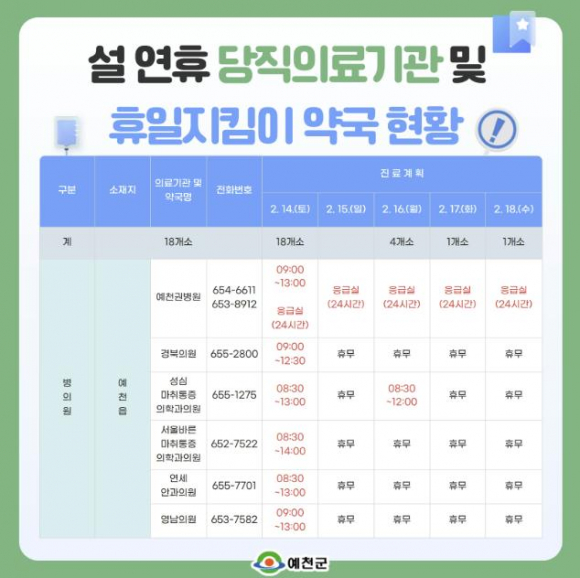 예천군은 설 연휴 동안 관내 병․의원 당직의료기관과 휴일 지킴이 약국을 운영해 진료 편의와 응급진료 서비스를 제공한다.예천군은 주민과 귀성객의 의료 불편 해소를 위해 응급의료기관인 예천권병원을 중심으로 24시간 비상 진료체계를 구축하고, 보건소는 비상진료상황실 운영 및 예천소방서와 연계를 통해 진료가 가능한 의료기관과 약국을 신속히 안내하는 등 긴급 지원 태세를 갖춘다.당직의료기관과 휴일 지킴이 약국 정보는 예천군청 홈페이지 또는 보건소·지소·진료소, 읍·면 행정복지센터, 병·의원, 약국 등에서 확인할 수 있다.또한, 연휴 기간 중 응급환자 발생 시 병·의원과 응급수술이 가능한 병원 정보는 129(보건복지콜센터), 119(구급 상황관리센터) 또는 응급의료정보센터 홈페이지에서 24시간 확인할 수 있다.연휴 기간 중 해열진통제, 감기약, 소화제 등 간단한 의약품은 안전 상비 의약품 판매점으로 등록된 24시간 운영 편의점 20곳에서 구매할 수 있으며, 내역은 보건소 홈페이지에 게시되어 있다.김학동 군수는 “연휴 동안 당직 의료기관 및 약국 운영으로 의료공백을 최소화해 주민들과 귀성객이 안심하고 명절을 보낼 수 있도록 최선을 다하겠다”고 말했다.