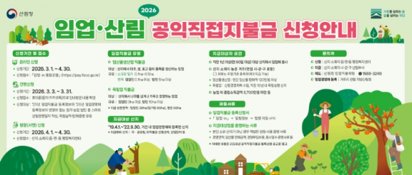 울진군은 임업·산림의 공익적 기능을 증진하고 임업인의 소득 안정을 도모하기 위해 2026년 임업·산림 공익직접지불금신청을 오는 3월부터 접수한다. 임업직불금은 산림을 경영하며 공익적 기능을 수행하는 임업인을 대상으로 직불금을 지급하는 제도이다. 울진군은 관내 임업인의 안정적인 소득 보전과 지속 가능한 산림경영을 위해 적극적인 신청을 당부했다. 신청 기간 및 방법 임업직불금 신청은 온라인·방문 신청 등 다양한 방식으로 가능하다. 온라인 신청은 2026년 3월 1일부터 4월 30일까지 임업-in 을 통해 가능하며 방문 신청은 2026년 4월 1일부터 30일까지 산지 소재지 읍·면 행정복지센터에서 접수할 수 있다. 지급 대상 산지 및 대상자 요건 지급 대상 산지는 2019년 4월 1일부터 2022년 9월 30일 사이 임업 경영체로 등록된 산지이며, 국·공유림, 타 직불금 신청 산지, 산업단지 등은 지급 대상에서 제외된다. 지급 대상자는 직전 1년 이상(연 60일 이상) 대상 산지에서 임업에 종사한 임업인으로, 산지 소재지 농촌에 거주해야 한다. 또한 임산물 생산업의 경우 연간 임산물 판매금액 120만 원 이상, 농업 외 종합소득금액 3,700만 원 미만 등의 요건을 충족해야 한다. 임업직불금 유형 임업직불금은 다음 두 가지 유형으로 구분된다. 임산물 생산업 직불금은 대추, 밤, 표고 등 임산물을 생산하는 임업인을 대상으로 하며,육림업 직불금은 산지에서 나무를 심거나 가꾸는 육림업 종사 임업인에게 지급된다. 유형별로 지급 기준 면적과 상한 면적이 다르므로 신청 전 세부 요건 확인이 필요하다. 임업직불금 신청과 관련한 자세한 사항은 울진군청 산림과, 산지 소재지 읍·면 행정복지센터 또는 산림청 임업직불제팀으로 문의하면 된다. 울진군 관계자는 “임업직불금은 임업인의 소득 안정뿐만 아니라 산림의 공익적 가치를 높이는 중요한 제도”라며 “임업인들은 신청 기간을 놓치지 말고 꼭 신청해 주시길 바란다”라고 말했다.