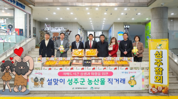 성주군은 2월 13일, 다양한 판로 개척을 통한 지역 농가 소득증대를 위하여 자매결연기관인 달서구청에서 농특산물 판매행사를 개최했다. 이번 행사는 달서구 공무원 및 유관기관, 주민들을 대상으로 성주군 농·특산물을 사전예약 주문받아 전달하는 방식으로 진행됐으며, 평소 유통망 확보 및 상품홍보에 어려움을 겪고 있는 중소농가 등이 참여하여 참외, 고구마, 표고버섯, 참외유과, 참외잼 등 성주군 우수 농특산물 1천여만원을 판매하는 성과를 거두었다. 고품질의 농특산물을 시중보다 합리적 가격으로 소비자에게 공급함으로써 큰 호응을 얻었으며, 설 물가 안정에 기여하고 두 지역 간 교류가 강화되는 장이 마련됐다. 성주군 관계자는“달서구는 가장 가까운 자매결연도시로, 앞으로도 우호증진과 도농상생 발전을 위해 더욱 노력할 것이다. 또한 우리군의 우수 농특산물을 소비자에게 홍보하고 농가 소득 향상에도 도움을 줄 수 있는 뜻깊은 행사를 계속해서 마련하겠다.”고 전했다.