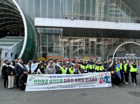 구미시는 민족 최대 명절인 설을 앞두고 지난 13일 구미역 일원에서 제338차 안전점검의 날을 맞아 `안전한 설 명절 보내기 캠페인`을 개최했다. 이날 행사에는 구미시 재난안전네트워크 회원 150여 명이 참여해 귀성객과 시민을 대상으로 생활 밀착형 안전수칙을 집중 홍보했다.참여자들은 구미역과 새마을중앙시장을 찾은 시민들에게 전기·가스 사용 증가에 따른 화재 예방수칙을 안내하고, 고향 출발 전 차량 점검 등 귀성·귀경길 교통사고 예방요령을 설명했다. 아울러 연휴 기간 가정과 다중이용시설의 자율 안전점검 실천을 당부하며, 작은 위험요소도 사전에 점검하는 생활 속 안전문화 확산에 힘을 모아줄 것을 요청했다. 특히 일상에서 발견한 위험요소는 ‘안전신문고’ 앱을 통해 즉시 신고할 수 있도록 안내해 시민 참여형 안전관리 체계를 강조했다.김팔근 행정안전국장은 “명절 연휴는 평소보다 안전사고 위험이 높다”며 “기본 안전수칙을 철저히 지켜 안전한 설 명절을 보내길 바란다”고 말했다. 이어 “시민과 함께하는 안전문화 정착으로 더욱 안전한 구미를 만들어가겠다”고 밝혔다.한편 구미시는 계절별·시기별로 발생 가능한 안전 위험요소에 선제 대응하기 위해 매월 4일 ‘안전점검의 날’을 운영하고 있다.
