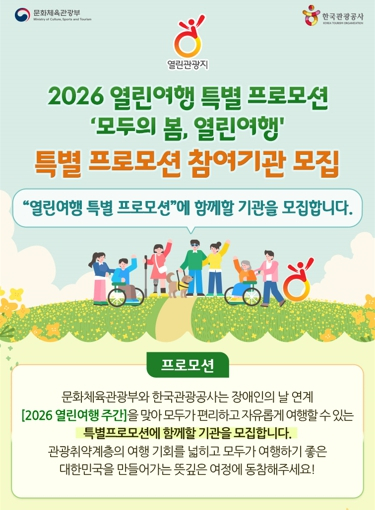 안동시는 한국관광공사가 주관하는 ‘모두의 봄, 열린여행’ 특별 프로모션에 적극 참여하기 위해, 관내 관광시설 운영사 및 사업체를 대상으로 오는 3월 6일까지 참여기관을 모집한다.이번 프로모션은 4월 20일 ‘장애인의 날’을 맞아 관광취약계층의 여행 접근성을 높이기 위해 4월 한 달간 진행될 예정이다.참여를 희망하는 관광시설(숙박․식음료․카페 등), 여행사, 체험시설 등의 운영사는 입장료․체험료 할인, 숙박할인, 특별 메뉴 제공 등 자체적인 할인 또는 혜택을 제안해 신청할 수 있다. 온라인 폼으로 신청받은 참여사의 제안을 한국관광공사의 평가 후 3월 말 최종 참여사가 확정될 예정이다.참여사의 특별 프로모션 상품 등은 한국관광공사 ‘대한민국구석구석’, ‘열린관광, 모두의 여행’ 공식 누리집 내 특별 프로모션 전용 페이지에 입점하게 되고, SNS 홍보를 통해 지원한다. 자세한 내용은 ‘열린관광, 모두의 여행’ 혹은 안동시청 누리집 시정소식의 공고를 통해 확인 할 수 있다.안동시 관계자는 “무장애관광 인프라 확충과 서비스 개선을 통해 누구나 편안하게 안동을 방문하고 즐길 수 있는 관광도시를 만들기 위해 노력하고 있다”며 “관광 사업자의 많은 관심과 참여를 기대한다”고 밝혔다.