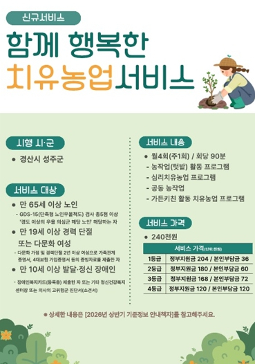 경상북도농업기술원은 2026년부터 치유농업을 활용한 *지역사회서비스를 본격적으로 추진, 공공형 치유농업을 확산해 지역 주민 삶의 질 향상과 지속 가능한 치유 서비스 제공 체계를 마련한다.* 지역사회서비스 : 지역특성 및 주민수요에 맞는 사회서비스를 발굴·기획하여 서비스 이용자에게 이용권(바우처)을 발급하여 서비스를 이용하는 제도 이번 복지바우처사업은 경북행복재단(지역사회서비스지원단)과 업무협약을 바탕으로 개발됐으며, 농업과 복지를 연결하는 생활밀착형 사회서비스모델을 구축했다는 점에서 큰 의미가 있다.올해는 경산시와 성주군을 중심으로 치유 서비스를 제공할 계획이며, 서비스 대상은 만 65세 이상 노인, 만 19세 이상 다문화 여성, 만 10세 이상 발달·장애인 등 돌봄이 필요한 지역 주민을 중심으로 운영된다. 특히 우수 치유농업시설 등 전문 시설을 활용해 안전하고 체계적인 치유 프로그램을 제공할 예정이다.주요 치유 서비스는 대상자 맞춤형 원예 활동, 집단 활동, 영양교육, 심리 치유 프로그램 등 농작업 활동과 자연을 기반으로 한 다양한 활동으로 구성되며, 이를 통해 참여자의 정서적 안정과 사회적 관계 회복을 지원할 예정이다.그동안 경북농업기술원은 2022년 전국 최초로‘치유농업센터’를 구축하고, 치유농업 서비스 제공기관의 전문성과 신뢰성을 확보하기 위해 매년‘치유농업시설 운영자 교육(150시간)’을 진행하고 있으며, 농촌진흥청이 지정하는 ‘우수치유농업시설 품질인증’ 시설 7개소를 육성하는 등 치유농산업의 체계적인 지원과 서비스 품질 향상을 위한 거점기관으로 기능해 왔다.또한 국민건강보험공단 대구경북지역본부 만성질환 예방 사업과 대구·경북교육청 직무연수 등 관계 기관과의 연계를 통해 치유농업 활성화를 선도했으며, 그 성과를 인정받아 지난해 치유농업 중앙경진대회에서 우수기관으로 선정됐다.조영숙 경상북도농업기술원장은“이번 시범 사업은 일회성 체험에 그치는 것을 넘어 치유농업을 체계적 공공 복지서비스 영역으로 확장한 의미 있는 사례”라며, “시범운영 결과를 토대로 향후 도내 전 시군으로 단계적 확대를 검토하고, 농업과 복지가 상생하는 경북형 사회서비스 모델로 정착시켜 나가겠다.”라고 밝혔다.