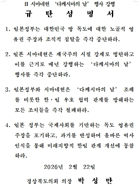 경상북도의회는 일본 시마네현이 2월 22일 이른바 ‘다케시마의 날’ 행사를 개최한 데 대해 깊은 유감을 표명하며, 독도에 대한 부당한 인식을 담고 있는 ‘다케시마 조례’의 즉각적인 폐기를 촉구하는 성명을 발표했다. 시마네현은 2005년 ‘다케시마의 날’ 조례를 제정한 이후, 2006년부터 매년 관련 행사를 이어오며 독도에 대한 일방적인 영유권 주장을 반복해 왔다. 특히 2024년부터는 동해를 형상화한 카레 음식과 독도 모형 위에 ‘죽도(竹島)’ 깃발을 꽂은 이른바 ‘다케시마 카레’를 현청 구내식당에서 판매하는 등 논란을 키우는 행보를 보이고 있다. 박성만 의장은 “음식이라는 일상적인 매개를 통해 특정한 역사 인식을 표현하는 방식은 이웃 국가의 국민들에게 상처와 우려를 줄 수 있다”며 “이러한 시도가 한일 간의 상호 이해와 미래지향적 관계 형성에 도움이 되는지 진지하게 되돌아볼 필요가 있다”고 밝혔다. 아울러 “독도는 과거와 현재, 그리고 앞으로도 대한민국의 영토인 만큼, 정부와 외교 당국이 원칙에 기반한 차분하면서도 단호한 외교적 대응을 이어가 주길 바란다”고 말했다. 연규식 독도수호특별위원회 위원장은 “역사 문제는 왜곡이 아닌 사실과 책임 있는 태도를 통해 다뤄져야 하며, 그렇지 않을 경우 그 부담은 결국 미래 세대에게 돌아가게 된다”고 지적했다. 이어 “대한민국의 주권과 영토에 대한 어떠한 도전도 결코 바람직하지 않다”며 “시마네현은 ‘다케시마 조례’를 폐기하고, 일본 정부 역시 시마네현의 행동이 양국 관계에 미칠 영향을 엄중히 인식해야 할 것”이라고 강조했다.