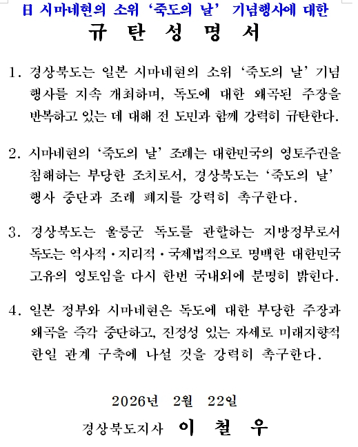 경상북도는 22일, 일본 시마네현이 소위 ‘죽도의 날’ 행사 개최에 대해 강력히 규탄하며, 행사 즉각 중단과 관련 조례 폐지를 촉구했다.경상북도는 시마네현이 제정한 ‘죽도의 날’ 조례가 대한민국의 영토주권을 침해하는 부당한 조치임을 지적했다.이철우 경북도지사는 “독도는 역사적‧지리적‧국제법적으로 명백한 대한민국 고유의 영토”라고 강조하며, “일본은 독도에 대한 부당한 주장을 즉각 중단하고, 미래지향적인 한일 관계 구축에 책임 있는 자세로 임해야 한다”고 강조했다.최근 일본 총리 재신임 등 정치적 환경 변화에도 불구하고, 일본 정부의 독도에 대한 기본적 영유권 주장 기조에는 변함이 없으며, ‘죽도의 날’ 행사 역시 매년 반복 개최되고 있다. 경상북도는 이러한 행사가 한일 간 건전한 우호·협력 관계 발전에 도움이 되지 않는다는 점을 분명히 했다.경상북도는 울릉군 독도를 관할하는 지방정부로서 독도의 평화적 관리와 영토주권 수호를 위해 지속적으로 노력하고, 대한민국의 확고한 입장을 국내외에 적극 알릴 방침이다.