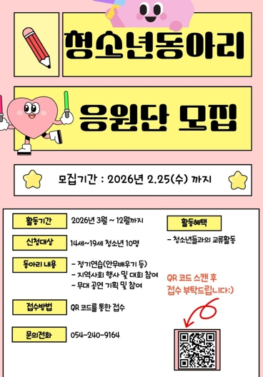 포항시청소년재단 남구청소년문화의집은 오는 25일까지 14세부터 19세 청소년을 대상으로 청소년동아리 ‘응원단’ 회원을 모집한다. 이번 활동은 포항공과대학교(POSTECH) 동아리 ‘치어로’ 소속 대학생들이 청소년동아리 ‘응원단’ 회원들에게 안무를 직접 지도할 예정이며, 참여 청소년들은 안무 습득은 물론 이를 바탕으로 다양한 축제에 참가해 무대 경험을 쌓게 될 예정이다. 참여를 희망하는 청소년은 포항시청소년재단 홈페이지 공지사항 또는 남구청소년문화의집 인스타그램에 게시된 QR코드를 통해 신청할 수 있다.박시현 남구청소년문화의집 관장은 “이번 활동은 대학생과 청소년이 함께 어우러져 다양한 경험을 나누고 에너지를 발산할 수 있는 의미 있는 기회”라며, “재능과 열정을 가진 청소년들의 많은 관심과 참여를 바란다”고 말했다.기타 청소년 활동 및 프로그램에 관한 자세한 사항은 남구청소년문화의집으로 문의하면 된다.