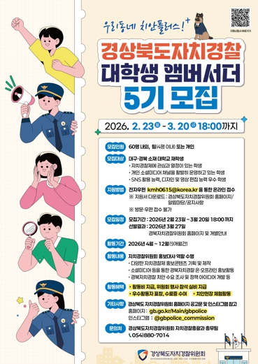 경상북도자치경찰위원회는 대구⋅경북 지역 대학생을 대상으로 2월 23일부터 3월 20일까지 ‘경북자치경찰 대학생 앰버서더 5기’를 모집한다고 밝혔다.경북자치경찰위원회 앰버서더는 2021년 자치경찰제 시행 이후 자치경찰에 대한 도민 인지도 제고를 위해 2022년 ‘경북자치경찰 대학생 앰버서더 1기’를 시작으로 총 200여 명의 대학생이 참여해 왔다. 참여 학생들은 자치경찰제와 관련 정책을 참신한 아이디어와 청년의 시각으로 알리는 홍보 활동을 펼쳐왔다. 이번 제5기 대학생 앰버서더는 대구·경북 소재 대학교 재학생으로 자치경찰제에 관심과 열정이 있고 개인 소셜 미디어 및 SNS 활용 능력이 뛰어난 학생이라면 누구나 지원할 수 있다. 개인 또는 팀(4명 이내)으로 참여가 가능하다. 선발된 앰버서더는 4월부터 12월까지 약 9개월간 경상북도자치경찰 홍보대사로서 활약하게 되며, 월별 미션 수행에 따른 활동비 지원, 앰버서더 리더십 함양 교육, 치안 현장 체험 등의 프로그램에 참여하게 된다. 연말 우수활동팀에 대한 표창 및 수료로 연간 일정을 마무리 하게 된다.신청은 경상북도자치경찰위원회 누리집 또는 경상북도 누리집에 접속해 지원신청서 등을 작성한 뒤 전자우편으로 제출하면 된다.※ 앰버서더 : 국가, 기업에서 유명인·전문가·대학생 등 각계각층 인사를 선정해 다양한 홍보‧마케팅 활동을 펼치는 홍보대사를 뜻함.손순혁 경상북도자치경찰위원장은 “자치경찰제가 지속적으로 발전하기 위해서는 도민의 관심과 소통이 중요하다”며 “대학생 앰버서더는 자치경찰을 도민에게 친근하게 알리고 소통하는 역할을 수행해 왔다. 제5기 앰버서더 역시 참신한 아이디어와 열정으로 자치경찰의 활동을 알리고, 도민과 함께하는 안전한 지역사회 조성에 기여할 것으로 기대한다”고 말했다.