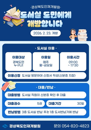 경상북도인재개발원은 신청사 이전을 계기로 지역사회와 상생하는 공공 교육기관으로서의 역할을 강화하고자, 오는 2026년 2월 23일부터 도서실을 지역주민에게 개방한다. 이는 인재개발원이 추진 중인 ‘지역사회 동행 프로젝트’의 일환으로 교육생과 직원 중심으로 운영되던 도서실을 지역주민에게도 개방함으로써 소장 도서의 활용도를 높이고 공공서비스 기능을 확대하기 위해 마련됐다.경북에 거주하는 주민이면 누구든 이용할 수 있고, 이용은 “평일(월~금) 오전 9시부터 오후 5시 30분까지(점심시간 제외)”이다.우선 이용하기 위해서는 신분증을 지참하고, 인재개발원 3층 도서실을 방문하여 `회원가입 신청서`와 `개인정보 수집·이용 동의서`를 작성하면 도서실 이용·대출이 가능하다. 도서실 이용자 편의를 위해 1층에 도서 반납함을 설치하고, 복합기 설치 등 편의시설도 순차적으로 마련할 계획이다.또한, 인재개발원은 청사 시설을 일반에 개방하여 운영 중이다. 강의실 및 분임토의실 등 청사 시설에 대해 대관 신청을 받아, 사용허가 요건을 충족하는 공익 목적의 행사・교육 등에 사용할 수 있도록 하여 도민과 함께하고 지역과 상생하는 사회적 가치를 실현하고 있다.우광진 경상북도인재개발원장은 “이번 도서실 개방은 단순한 공간 개방을 넘어, 인재개발원이 지역사회의 일원으로서 지식과 자원을 공유하는 열린 공공교육 플랫폼으로 전환하는 첫걸음”이라며 “지역주민 누구나 부담 없이 찾아와 책을 읽고 배움을 이어갈 수 있는 공간을 제공함으로써 교육기관과 지역사회가 함께 성장하는 선순환 구조를 만들어 가겠다”고 말했다. 이어“앞으로도 인재개발원은 도서실을 비롯한 다양한 교육·문화 자원을 단계적으로 개방해, 지역 주민의 평생학습을 지원하고 공공기관으로서의 사회적 책임을 충실히 이행해 나가겠다”고 덧붙였다.