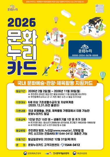 영덕군은 저소득층의 문화생활을 지원하고 소득 차에 의한 문화소비의 격차를 줄이기 위해 지난 2일부터 ‘통합문화이용권 지원사업’을 시행하고 있다.이번 사업은 일상에서의 문화 향유와 참여를 확대하기 위한 현 정부의 국정과제로서, 6세 이상 기초생활수급자, 차상위 계층을 대상으로 문화생활 지원금을 지급하는 것을 골자로 한다.이에 기초생활수급자, 차상위 계층에게 1인당 연간 15만 원의 문화누리카드를 지급하고, 올해부터는 13~18세의 청소년기와 60~64세의 준고령기 대상자에겐 1만 원의 생애주기별 지원금이 더해진다.문화누리카드는 전국 3만 5,000여 개의 문화예술, 국내 여행, 체육 분야 가맹점에서 이용할 수 있으며, 영화 관람료 2,500원 할인, 4대 프로스포츠(배구, 농구, 축구, 야구) 관람료 최대 40% 할인, 공연∙전시 관람료, 악기 구매비, 숙박료, 놀이공원(테마파크) 입장권, 체육시설 이용료, 스포츠용품 할인(각 가맹점 할인율 상이) 등 다양한 혜택도 함께 제공한다.카드 신청은 11월 30일까지 전국 읍․면․동 주민센터와 ‘문화누리카드’ 누리집, 모바일 앱 등을 통해 할 수 있으며, 발급받은 카드는 12월 31일까지 사용할 수 있다.이미 카드를 발급받은 사람은 전년도 카드 사용 실적이 3만 원 이상이고, 올해도 수급 자격을 유지할 경우 별도의 신청 없이 지원금이 기존 카드에 충전된다. 자동충전이 완료된 대상자에겐 알림 문자가 발송되며, 전국 읍․면․동 주민센터와 ‘문화누리카드’ 누리집, 전화, 모바일 앱 등을 통해서도 충전 여부와 사용 현황을 확인할 수 있다.영덕군 관내 주요 가맹점으로는 시외버스터미널, 기차역, 서점, 사진관, 펜션, 온천, 체육용품 판매점 등이 있으며, 가맹점 신규등록은 경상북도 지역 주관처인 경북문화재단으로 신청하면 된다.
