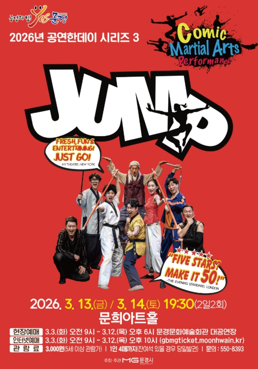 문경문화예술회관에서는 화려한 공중회전을 선보이는 아크로바틱과 고난이도 동양 무예, 슬랩스틱 코미디가 어우러진 넌버벌 퍼포먼스 점프(JUMP) 공연을 3월 13일 19:30, 14일 19:30 (2일 2회)에 문희아트홀에서 개최한다.이번 작품은 무술 고수 가족의 집에 엉뚱하고 귀여운 도둑들이 들어와 벌어지는 해프닝을 대사없이 생생한 라이브 액션과 절묘한 코믹연기로 표현해 온 가족 누구나 쉽게 이해하고 즐길 수 있는 유쾌한 공연이다.점프(JUMP)는 전 세계 600만 명이 관람한 세계적인 퍼포먼스로 화려한 무예, 무술, 무도, 아크로바틱과 극적인 드라마의 재미까지 더해져 세계 공연무대에서 찬사와 호평을 받는 작품이다.입장권은 전석 3,000원(5세 이상 관람가)이며, 오는3월 3일 오전 9시부터 현장 예매(대공연장)와 인터넷 예매가 가능하다. 자세한 사항은문경시청홈페이지에서확인할수있다.