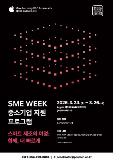 포항시와 애플 제조업 R·D 지원센터(포항공과대학교 내)는 지역 제조업의 디지털 혁신을 가속화하고 중소기업의 스마트 제조 역량 강화를 위해 내달 24일부터 26일까지 3일간 ‘SME Week 중소기업 지원 프로그램’을 개최한다. 애플 제조업 R·D 지원센터는 애플이 전 세계 최초로 설립한 제조업 특화 R·D 지원기관으로, 포항공과대학교의 연구 인력과 글로벌 기업 전문가, 첨단 장비를 기반으로 중소기업의 제조 기술 고도화를 지원하고 있다. 포항시는 지역 제조기업의 경쟁력 제고와 산업구조 고도화를 위한 정책 사업의 하나로 센터 운영을 지원하고 있으며, 지원센터는 스마트 제조 관련 장비와 전문 인력을 활용해 국내 중소기업과 스타트업을 대상으로 교육·컨설팅·분석 서비스를 무상으로 제공하고 있다. SME Week은 국내 중소 제조기업의 경쟁력 강화를 위해 기획된 프로그램으로 ▲스마트 데이터 ▲스마트 공정 ▲스마트 품질 랩 엔지니어들의 실무 중심 강연과 더불어, ▲스마트 제조 친환경 전략 ▲ESG 경영 관점에서의 AI 등을 주제로 한 외부 전문가들의 강연이 진행된다. 특히 스마트 제조를 통해 지속 가능한 제조 전략과 미래지향적인 경쟁력을 확보한 대기업 사례를 공유하는 특강이 마련돼, 참가 기업들이 실제 제조 현장에서 기술 혁신이 비용 절감과 품질 안정, 운영 효율 향상으로 이어지는 과정을 구체적으로 이해할 수 있을 것으로 기대된다. 아울러 지원센터 스마트 공정·품질 랩이 개발한 교육 프로그램도 처음 공개된다. SME Week은 3월 24일과 25일 양일간 진행되며, 마지막 날인 26일에는 지원센터 엔지니어와의 1대1 컨설팅이 진행된다. 참가 기업은 자사 제조 환경과 기술 과제를 직접 논의하며 실질적인 개선 방향을 모색할 수 있으며, 컨설팅은 사전 신청을 통해 진행된다. 참가 신청은 애플 제조업 R·D 지원센터 홈페이지에서 가능하며, 문의사항은 이메일로 하면 된다. 이상엽 일자리경제국장은 “스마트 제조 전환은 지역 제조업의 지속 가능한 성장을 위한 중요한 과제”라며, “이번 SME Week에 지역 중소 제조기업들이 적극 참여해 스마트 제조 관련 최신 기술과 사례를 접하고, 현장에서 체감할 수 있는 성과로 이어지길 기대한다”고 밝혔다.