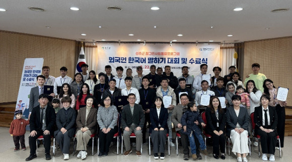 성주군은 2월 22일 성주문화예술회관 소강당에서 외국인 주민 및 가족 60여 명이 함께 참여한 가운데 외국인 한국어 말하기 대회 및 수료식을 개최했다. 2025년 7월부터 성주군 혁신지원센터에서 운영된 한국어 과정은 매주 일요일 오전 10시부터 오후 5시까지 총 30주에 걸쳐 초급, 중급 2개 반과 쓰기반, 온라인 TOPIK 반 등 4개 반으로 운영됐으며 총 66명의 외국인 근로자가 참여했고, 그 가운데 70% 이상 수업에 참여한 28명의 수강생이 수료증을 받았다. 또한, 수료식과 함께 개최한 외국인 한국어 말하기 대회는 참그린 사회통합프로그램의 일환으로 운영된 한국어 교실(초급반, 중급반)이 유종의 미를 거두기 위해 그 간의 노력의 결과를 선보이는 장이 됐으며, “나의 한국 생활 이야기”라는 주제를 가지고 14명의 외국인 참가자가 발표하여, 각 반별로 대상, 최우수상, 우수상 등 총 6명의 학습자가 수상했다. 한국어 말하기 대회에 참가하여 초급반 대상을 차지한 베트남 출신의 도반망 씨는“타국 생활이 낯설고 힘들었는데, 참그린 사회통합프로그램을 통해 한국어 수업과 다양한 문화체험 기회를 접하게 되어 문화 차이를 극복하고 한국 생활에 잘 적응할 수 있게 되어 감사하다.”라고 전했다. 참그린 사회통합프로그램은 지방소멸대응기금을 활용한 사업으로 프로그램 내용은 △비자 취득을 위한 수준별 한국어 교실, △한글 쓰기 수업, △한국 법령 교육과 함께 다양한 △문화체험 프로그램을 포함하고 있다. 성주군은 앞으로도 참그린 사회통합프로그램을 통해 관내 외국인 근로자들의 지역사회 적응과 정착 과정을 계속해서 지원할 예정이다.