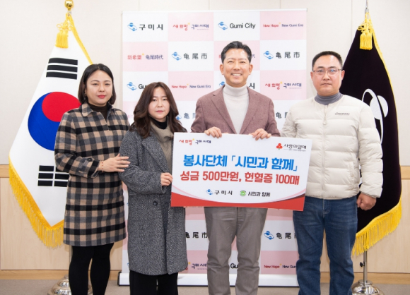 구미시는 지난 24일 봉사단체 시민과함께(대표 이상혁)로부터 이웃돕기성금 500만원과 헌혈증 100매를 기탁받았다.이번 기탁은 지난해 12월 31일 동락공원에서 열린 `2026 새해맞이 시민 안녕행복 기원행사` 봉사에 참여하고 받은 교통비와 회원들이 모은 성금 등으로 마련됐다. 성금은 관내 취약계층 지원 사업에 사용되며, 헌혈증은 수혈이 필요한 이웃을 위해 전달될 예정이다.김장호 구미시장은 “헌혈캠페인을 통해 모은 헌혈증과 회원들의 정성이 담긴 성금을 기탁해 주셔서 감사하다”며 “지역사회를 위한 따뜻한 나눔이 계속 이어지길 기대한다”고 말했다.2022년 창단한 시민과함께는 현재 150여 명의 회원이 활동하고 있다. 환경정화 활동, 헌혈캠페인 등을 비롯한 다양한 봉사활동을 전개하고 있으며, 연말연시 이웃돕기성금 기탁에도 참여하는 등 지역사회를 위한 나눔을 실천하고 있다.