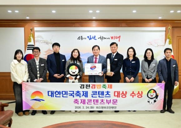 김천시는 지난 2월 24일 서울 용산 피스앤파크 컨벤션에서 열린 ‘제14회 대한민국 축제콘텐츠 대상’에서 축제콘텐츠 부문 대상을 수상했다. 이는 지난해 축제프로그램 특별상에 이어 2년 연속 수상한 값진 성과로, 특히 축제의 핵심이라 할 수 있는 콘텐츠 부문에서 대상을 받으며 대한민국 대표 축제로 성장 가능성을 입증했다. 대한민국 축제콘텐츠 대상은 축제 전문가로 구성된 전문위원들이 전국의 우수한 축제 중 △축제 운영성과 △친환경 축제 운영, △방문객 인지도 및 만족도, △지역민 지지도 △콘텐츠 차별성 등을 종합적으로 평가하고, 서류 및 최종심사를 거쳐 2025년 대한민국 대표 축제를 선정하는 권위 있는 상이다. 이번 김천김밥축제는 단순한 음식행사를 넘어 문화 콘텐츠로 확장해, 형식적인 개막식 대신 관광객 참여 중심의 프로그램으로 차별화된 체험형 콘텐츠를 구성, 방문객이 주인공이 되는 축제로 구현해 높은 평가를 받았다. 특히, 지역특산물을 활용한 김밥쿡킹대회, 직접 재료를 골라 만들어 먹는 김밥 창작소, 김밥큐레이터의 전국이색김밥 토크쇼, 캐릭터 ‘꼬달이’ 1주년 기념 돌잔치 등 특색있는 콘텐츠를 통해 축제 완성도를 한층 끌어올렸다. 배낙호 김천시장은 “지난해 특별상에 이어 올해 축제콘텐츠 부문 대상까지 수상하게 되어 매우 뜻깊다. 부족한 부분은 보완하고 콘텐츠 경쟁력은 지속적으로 강화해 꼭 경험해 봐야 하는 대한민국 대표 축제로 자리 잡을 수 있도록 발전시켜 나가겠다.”라고 말했다.