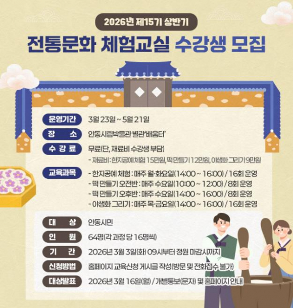 안동시립박물관은 3월 3일부터 안동시민을 대상으로 ‘제15기 상반기 전통문화체험교실’ 수강생을 모집한다.전통문화체험교실은 시민의 여가 선용에 이바지하고, 나아가 전통문화의 대중화를 유도해 우리의 전통문화를 유지․보존하고자 개설된 교육 프로그램으로, 매년 수강생 모집이 조기에 마감될 정도로 있기가 높다.상반기 전통문화체험교실은 △한지공예 체험 △떡 만들기 △야생화 그리기 중 원하는 교육을 선택해 수강할 수 있다.한지공예 체험은 총 16회 과정으로, 초보자도 쉽게 따라 할 수 있는 실습을 통해 실생활에 사용할 수 있는 서랍장 등을 제작해 볼 수 있다.떡 만들기는 총 8회 과정으로 운영된다. 설기떡과 약밥 등 우리 전통 떡을 가정에서도 간편하게 만들 수 있도록 실습 위주의 교육을 진행하며, 시민의 편의를 위해 오전반과 오후반으로 나눠 운영한다.야생화 그리기는 총 16회에 걸쳐 봄의 정취를 담은 야생화와 전통 민화를 소재로 진행된다. 수강생들은 본인의 작품을 손수건이나 가방 등에 직접 그려 넣어 소장 가치가 높은 나만의 소품을 완성하게 된다.교육은 3월 중순부터 5월 중순까지 안동시립박물관 별관 배움터에서 진행되며, △한지공예(월․화 오후 2~4시) △떡 만들기(수 오전 10~12시 / 오후 2~4시) △야생화 그리기(목․금 오후 2~4시)로 편성됐다.수강 신청은 안동시민이라면 누구나 가능하며, 안동시립박물관 누리집을 통한 온라인 접수만 지원한다. 박물관 관계자는 “이번 교육이 시민들에게 전통문화에 대한 거리감을 해소하는 소중한 시간이 되길 기대한다”며, “선착순 모집인 만큼 관심 있는 분들은 서둘러 신청해 주시길 바란다”고 전했다.