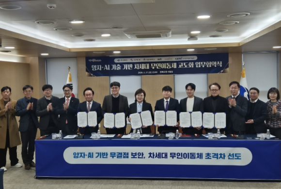 경상북도와 구미시가 미래 첨단기술인 양자와 인공지능(AI)을 결합해 차세대 무인이동체 시장의 주도권 확보에 나선다.2월 27일 경북도청 회의실에서 양금희 경상북도 경제부지사, 정성현 구미부시장을 비롯해 윤지원 SDT(주) 대표, 신동주 ㈜모빌린트 대표, 최호성 경운대학교 부총장, 문추연 구미전자정보기술원 원장이 참석한 가운데 `양자·AI 기술 기반 차세대 무인이동체 고도화를 위한 업무협약(MOU)`을 체결했다.이번 협약은 양자보안기술(QRNG)과 AI반도체(NPU)를 무인이동체에 접목해 보안성과 지능성을 동시에 고도화하고, 이를 통해 지역 특화산업 경쟁력을 강화하기 위한 상호 협력체계를 구축하기 위해 마련됐다.최근 차세대 무인이동체는 공공안전과 산업시설 점검, 국방·치안 등으로 활용이 빠르게 확대되고 있다. 그러나 데이터 전송 보안과 실시간 AI 처리 기술은 여전히 핵심 과제로, 기존 PRNG 기반 보안체계의 한계를 보완할 QRNG 기술이 차세대 대안으로 주목받고 있다.이에 따라 참여 기관들은 양자보안(QRNG)과 AI(NPU) 기술을 기반으로 한 차세대 무인이동체 고도화를 공동 목표로 설정하고, 보안 강화와 지능화 기술 확보를 위해 상호 협력하기로 했다.특히 참여기관 간 협력과제로는 ▲양자 보안(QRNG) 및 AI(NPU) 기반 무인이동체 관련 공동 R&D ▲첨단과학기술(양자·AI 등) 분야 전문인력 양성 ▲지역 특화산업 연계 및 양자산업 생태계 조성 협력 등이 포함된다.이번 협력은 단순한 기술 교류를 넘어 공동 연구개발–실증–사업화–인력양성으로 이어지는 전주기 협력체계를 구축한다는 데 의의가 있으며, 양자·AI 기반 기술을 지역 주력산업과 단계적으로 연계해 나갈 방침이다.정성현 구미시 부시장은 “이번 MOU는 경상북도와 구미시, 양자·AI 선도기업, 대학·연구기관이 함께 미래 전략산업 육성을 위한 협력체계를 구축하는 출발점”이라며, “구미 주력산업에 양자·AI 기술을 접목해 새로운 성장동력을 확보할 수 있도록 행정·정책적 지원을 아끼지 않겠다”고 밝혔다 양금희 경상북도 경제부지사는“양자와 AI는 단순한 기술 진보를 넘어 미래산업의 판도를 바꿀 핵심 게임 체인저(Game Changer)”라며, “이번 협약은 경북이 ‘K-양자 산업’의 중심지로 도약하는 결정적 변곡점이 될 것”이라고 밝혔다. 이어 “세계 시장을 압도할 초격차 기술력을 확보하여, 경북을 차세대 무인이동체 산업의 글로벌 허브로 우뚝 세우겠다”고 덧붙였다.
