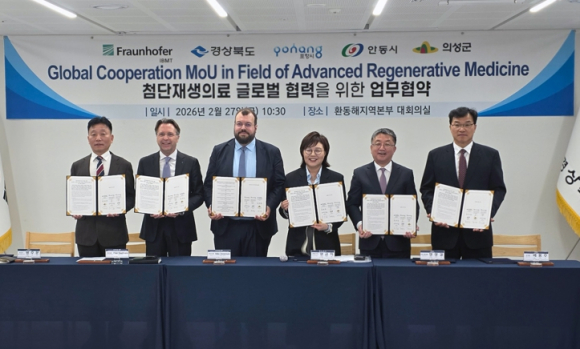 안동시는 경상북도, 포항시, 의성군과 함께 2월 27일 환동해지역본부(동부청사) 9층 대회의실에서 독일 프라운호퍼 IBMT 연구소와 ‘첨단재생의료산업 육성을 위한 업무협약 (MOU)’을 체결했다.이번 협약은 재생의학․바이오 제조․생명공학 분야에서 기관 및 산업 협력을 강화하고, 국제협력을 기반으로 첨단의료 기술 분야의 공동협력 기반을 마련하기 위해 추진됐다.이날 협약식에는 배용수 안동시 부시장을 비롯해 경상북도 경제부지사, 포항시 시장권한대행, 의성군 군수 등 관계자가 참석했으며, 프라운호퍼 IBMT 측에서는 하이코 짐머만 연구소장과 피터 호프만 행정실장이 함께했다. 참석자들은 협약 추진 배경과 협력 방향을 공유하고, 실질적인 공동과제 발굴과 협력 추진체계 구축에 뜻을 모았다. 프라운호퍼는 1949년 뮌헨에서 설립된 독일의 대표 응용연구기관으로, 독일 전역에 75개의 연구소․연구단위를 운영하며 약 3만 2천 명 규모의 연구 인력이 산업 수요 기반의 응용연구와 기술이전을 수행하는 글로벌 연구 네트워크로 평가받는다. 프라운호퍼 IBMT연구소는 1987년 설립돼 의료․바이오 분야 기술이전과 산업 적용을 지원하며, 줄기세포 연구와 바이오뱅크 등 분야에서도 역량을 보유하고 있다.협약의 주요 내용은 ▲경북–프라운호퍼 IBMT 간 글로벌 공동연구센터 설립 협력 ▲생명공학 기술 분야 연구․개발 ▲프로젝트별 ‘인에이블링 랩(Enabling Labs, F-Labs)’ 설치 ▲유럽 유도만능줄기세포 바이오뱅크(EBISC) 아시아 허브 구축 여건 조성 등이다.안동시는 이번 협약을 계기로 국제 공동연구 및 실증 기반을 확대하는 한편, 시가 중점적으로 육성해 온 백신․바이오 분야와 연계해 지역 산업경쟁력을 강화해 나갈 계획이다. 특히 협약이 공동연구 과제 기획과 현장 적용으로 이어질 수 있도록 실무 협의를 지속하고, 지역 기업․기관과의 연계를 강화해 연구성과의 확산과 사업화 기반 조성에도 힘쓸 방침이다.배용수 안동시 부시장은 “프라운호퍼 IBMT와의 협력은 지역 바이오․첨단의료 분야의 역량을 높이는 중요한 발판”이라며 “공동과제 기획부터 기업․기관 연계까지 협력 성과가 확산될 수 있도록 실무 협의를 지속하겠다”고 밝혔다.