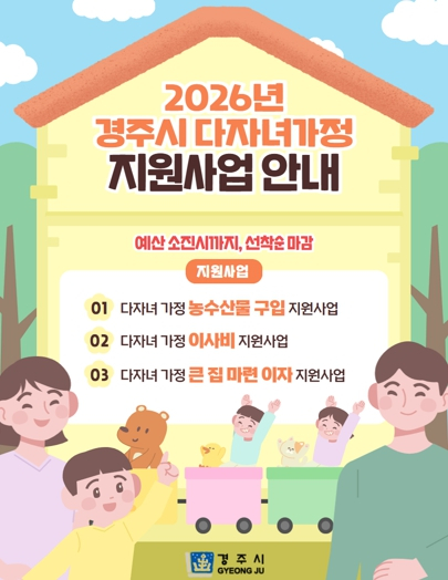 경주시는 다자녀 가정의 경제적 부담을 실질적으로 완화하고 안정적인 정주 기반을 강화하기 위해 ‘2026년 경주시 다자녀 가정 지원사업’을 3월부터 본격 시행한다고 밝혔다.이번 사업은 단순 생활비 지원을 넘어 ‘생활 지원-정주 지원-주거자산 형성 지원’으로 이어지는 3단계 구조로 설계된 것이 특징이다.다자녀 가정이 지역에 안정적으로 뿌리내릴 수 있도록 생애주기별 부담을 체계적으로 덜어주는 데 정책 초점을 맞췄다.먼저 ‘생활 안정 단계’로 추진되는 ‘다자녀 가정 농수산물 구입 지원사업’은 경주시에 주소를 둔 2자녀 이상 가정을 대상으로 경북 농특산물 온라인 쇼핑몰 ‘사이소’ 쿠폰을 지급하는 사업이다.자녀 수에 따라 5만 원에서 최대 10만 원까지 차등 지원하며, 3월 3일부터 ‘경북 저출생극복 통합 접수시스템’을 통해 신청할 수 있다. 다음으로 정주 여건 강화를 위한 지원도 이어진다.‘다자녀 가정 이사비 지원사업’은 2026년 1월부터 11월까지 경주시로 전입하거나 관내에서 이사한 2자녀 이상 가구를 대상으로 하며, 2024년 1월 이후 출생 자녀를 포함해 약 50가구를 선정한다.가구당 최대 40만 원까지 이사 비용을 지원하며, 신청은 3월 3일부터 정부24 혜택알리미를 통해 온라인으로 접수한다.특히 올해는 주거비 부담을 직접 경감하는 신규사업이 새롭게 도입된다.‘다자녀 가정 큰 집 마련 이자 지원사업’은 3자녀 이상 1주택 가구를 대상으로 주택구입 대출 이자를 연 최대 480만 원까지 지원하는 제도로, 다자녀 가정의 실질적인 주거 안정과 자산 형성을 동시에 뒷받침하기 위해 마련됐다.지원 대상은 부부 합산 연소득 1억 3,000만 원 이하 가구로, 주택가격 9억 원 이하이면서 전용면적 124㎡ 이하 주택이다.신청은 3월 16일부터 4월 3일까지 ‘경상북도 주거복지시스템`’에서 받는다.모든 사업은 예산 범위 내에서 선착순으로 지원한다. 주낙영 경주시장은 “다자녀 가정이 안정적으로 생활할 수 있도록 주거와 생활 전반을 아우르는 지원을 강화했다”며 “아이 낳고 키우기 좋은 도시 환경을 조성하기 위해 실효성 있는 대응정책을 지속적으로 추진하겠다”고 말했다.
