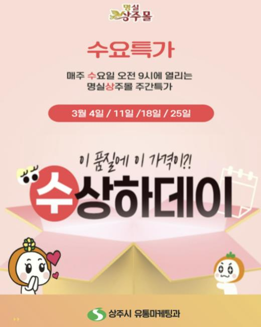 상주시는 지역 농특산물의 온라인 판로 확대와 소비 촉진을 위해 상주시 농특산물 공식 쇼핑몰 ‘명실상주몰’에서 3월부터 11월까지 매주 수요일 ‘수요특가 수상하데이’행사를 운영한다.명실상주몰은 상주시에 생산되는 우수 농특산물을 온라인으로 판매하는 공식쇼핑몰로, 지역 농가와 소비자를 직접 연결하는 비대면 유통 창구 역할을 수행하고 있다. ‘수요특가 수상하데이’는 행사 기간 동안 매주 할인 품목을 선정해 최대 50%까지 할인 판매하는 정기 프로모션이다. 소비자에게는 품질 좋은 상주 농특산물을 보다 합리적인 가격에 구매할 수 있는 기회를 제공하고, 생산 농가에는 지속적인 판매 기회를 지원하는 데 목적이 있다.특히, 수요특가 이벤트는 명실상주몰 이용 활성화와 신규 고객 유입확대를 위한 전략이 일환으로 추진 된다. 정기적인 할인행사를 통해 쇼핑몰 방문을 유도하고 재구매로 이어지는 소비 기반을 마련함으로써, 명실상주몰을 지역 농특산물 대표 온라인 플랫폼으로 육성해 나갈 계획이다.이번주 3월 4일에는 아키시아꿀 2.4kg, 참기름 180ml, 깐호두 300g, 실속형곶감 500g을, 다음주 3월 11일에는 청국장, 곶감약과 30g 30개, 완숙토마토 5kg, 표고호박차 등을 특별 할인가에 제공한다.상주시 관계자는 “수요특가 ‘수상하데이’를 통해 더 많은 소비자가 상주의 우수 농특산물을 합리적인 가격에 구매할 수 있을 것으로 기대한다”며 앞으로도 다양한 온라인 기획전과 할인 행사를 통해 명실상주몰을 활성화하고, 지역 농가의 실질적은 소득증대로 이어질 수 있도록 적극 지원하겠다“고 밝혔다.
