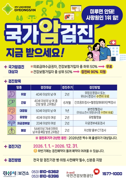 경산시는 시민들의 활기찬 한 해를 지원하기 위해 2026년도 국가건강검진 수검을 적극 권고하고 나섰다. 흔히 건강 관리 목표로 운동이나 식단 관리를 꼽지만, 본인의 현재 몸 상태를 정확히 파악하는 ‘건강검진’이야말로 건강 관리의 첫 시작이다.2026년도 국가건강검진 대상자는 20세 이상 짝수년도 출생자로, 일반건강검진 검진 항목은 혈압, 혈당, 흉부 방사선 촬영 등 만성질환 조기 발견을 위한 공통 항목과 성별 및 연령에 따라 이상 지질혈증, 간염 검사, 정신 건강검사 등이 포함되고, 국가암검진 암종별 검진 기준은 아래와 같은 대상과 주기로 진행된다.검진 대상자는 무료 또는 적은 비용으로 검진을 받을 수 있으며, 검진 기관으로 지정된 병·의원에 사전 예약 후 신분증을 지참해 방문하여 검진받으면 된다.우리 시의 주요 암 연령표준화 발생률(2016-2023년/10만 명당)은 위암 52.3명, 간암 25.0명, 대장암 65.4명, 폐암 52.7명, 유방암 53.0명, 자궁경부암 6.2명으로 나타났으며, 특히 대장암은 전국(58.7명)보다 높은 발생률을 보여 정기적인 국가 암검진을 통한 조기 발견이 매우 중요하다.또한, 국가 암 검진을 통해 암 진단을 받은 대상자 중 의료급여 수급권자 및 차상위 본인 부담 경감 대상자는 의료비 지원 기준에 준해 암 치료비를 연속 3년간 연간 최대 300만 원 지원한다.경산시는 시민들의 조기 수검을 독려하기 위해 ▲ SNS 홍보 및 시청 홈페이지 게시 ▲ 행정복지센터 홍보물 및 분변통 비치 ▲ 전광판 송출 및 안내 ▲ 검진 대상자 유선 및 문자 안내 등 다양한 방법을 통해 검진을 독려하고 있다.매년 전체 수검자의 약 40% 이상이 10월 이후 연말에 집중되는 경향이 있는데, 이 시기에는 예약이 어려울 뿐만 아니라 검진 대기 시간이 길어져 불편을 초래할 수 있다.안병숙 보건소장은 “비교적 여유로운 상반기에 검진을 받으면, 더욱 쾌적한 환경에서 꼼꼼하게 상담을 받을 수 있다”며 조기 검진의 장점을 강조했다.