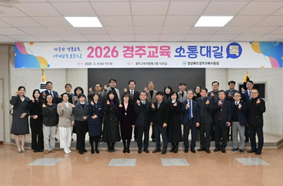 경상북도경주교육지원청은 3월 4일 오후 4시 30분, 청사 3층 다온실에서 임종식 교육감과 함께 하는 `2026 경주교육 소통대길 톡`을 개최했다. 이날 행사는 임종식 교육감을 비롯해 도교육청 관계자, 경주교육지원청 관계자, 관내 유‧초‧중‧고‧특수학교 교(원)장, 학교운영위원회, 학부모회 대표, 학생상담자원봉사자회, 녹색어머니회, 마을학교 대표 등 경주교육의 핵심 주체 30여 명이 참석한 가운데 격식 없는 소통의 장으로 진행됐다. 이번 소통대길 톡은 단순한 경주교육 업무 보고를 넘어, 경북 교육의 미래에 대해 누구나 자유롭게 의견을 개진하는 토론 중심으로 운영되어 큰 호응을 얻었다. 참석자들은 ‘경북 교육에 바라는 점, 지역과 상생하는 교육 정책, 지역 교육 현안’ 등을 주제로 열정적인 토론과 공감 속에 활기찬 소통의 장을 이끌어냈다. 현안 협의 및 토론 후 이어진 마무리 말씀에서 임종식 경상북도교육감은 “경주 교육 가족들의 생생한 목소리는 경북 교육이 나아갈 올바른 방향을 제시하는 소중한 이정표”라며, “오늘 논의된 지역 상생 방안과 현안들을 교육 정책에 적극 반영하여, 아이들이 지역의 주인으로 성장할 수 있는 든든한 토대를 만들겠다.”고 밝혔다. 황영애 교육장은 “바쁜 일정 중에도 경주를 방문해 소통의 시간을 가져주신 교육감님과 교육 가족들께 감사드린다”며 “따뜻한 경북 교육이 현장에 깊이 뿌리내릴 수 있도록 최선의 지원을 다하겠다.”고 화답했다.