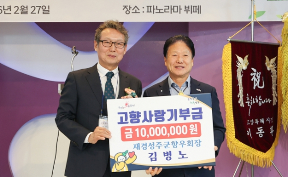 재경성주군향우회 김병노 회장이 지난달 27일 서울 종로구에서 열린‘2026년 재경성주군향우회 신년 교례회’에서 고향 발전을 위한 고향사랑기부금을 1,000만 원 기탁했다. 김병노 회장은 현재 재경성주군향우회장직을 맡아 향우들의 화합을 이끌고 있으며, 평소 남다른 애향심으로 고향 성주의 발전에 깊은 관심과 지원을 아끼지 않아 주변의 호평을 받아왔다. 김병노 회장은“이번 신년 교례회를 통해 고향 선후배들과 정을 나누게 되어 매우 뜻깊다”며“몸은 비록 타지에 있지만 마음은 늘 고향 성주와 함께하고 있는 만큼, 고향의 발전과 주민들의 복지 향상에 조금이나마 도움이 되길 바란다”고 소감을 전했다.