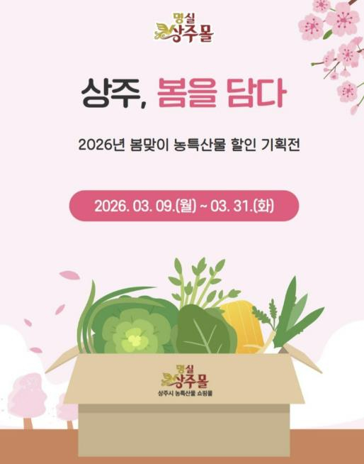 상주시는 봄을 맞아 시민들에게 신선한 농특산물 먹거리를 합리적인 가격에 제공하고, 지역 농가와 생산자의 판로 확대를 지원하기 위해 ‘상주, 봄을 담다’봄 농특산물 먹거리 온라인몰 할인 기획전을 운영한다.이번 기획전은 2026년 3월 9일부터 3월 31일까지 진행되며, 상주시 공식 온라인몰인 명실상주몰을 통해 나물류, 버섯류 등 봄철 농특산물 먹거리를 20% 할인된 가격으로 판매한다.이번 행사는 최근 물가 상승으로 인한 소비자 부담을 완화하고 지역 농특산물 소비를 촉진하기 위해 마련됐다. 상주시는 이번 기획전을 통해 지역 생산자와 소비자 간 상생을 도모하고, 시민들이 제철 농특산물을 보다 손쉽게 접하며 계절의 변화를 식탁에서 체감할 수 있도록 지원할 계획이다.상주시 관계자는 “이번 ‘상주, 봄을 담다’온라인 기획전을 통해 시민 여러분께서 봄 제철 농특산물을 부담 없이 즐기시고, 지역 농가와 생산자에게도 실질적인 도움이 되기를 기대한다”며 “앞으로도 상주시는 지역 농특산물 소비 활성화와 지역 경제 활력 제고를 위한 다양한 지원 정책을 지속적으로 추진해 나가겠다”고 밝혔다.