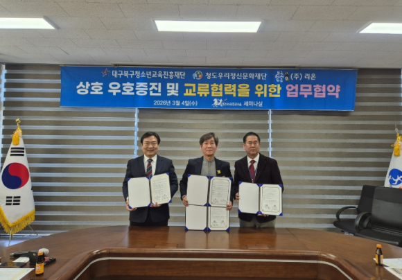청도우리정신문화재단(대표이사 기화서)은 지난 3월 4일 화랑정신을 이어가는 청도신화랑풍류마을에서 (재)대구북구청소년교육진흥재단(상임이사 이복우), 한국코미디타운 운영주체 ㈜리온(대표 김미숙)과 상호 우호 증진 및 교류 협력을 위한 업무협약(MOU)을 체결했다.이번 협약은 화랑정신과 새마을운동 정신을 바탕으로 청소년 대상 교육 프로그램을 공동 운영하고, 지역 관광 활성화를 통해 청도군 생활 인구 증대에 기여하기 위해 마련됐다. 특히 재단이 운영 중인 신화랑풍류마을과 새마을운동발상지기념공원을 중심으로 다양한 교류·협력 사업을 추진할 계획이다.협약의 주요 내용은 ▲청소년 관련 교류·협력 사업 개발 및 추진 ▲신화랑 및 새마을정신 함양을 위한 청소년 교육 및 활동프로그램 공동 개발·운영 ▲지역 관광 활성화를 위한 연계 관광상품 개발 ▲기관 발전을 위한 신규 교류·협력 사업 발굴 등이다.대구북구청소년교육진흥재단은 대구광역시 북구 지역의 청소년 교육과 활동을 지원하기 위해 설립된 공공 재단으로 청소년의 성장, 교육, 진로 탐색 등을 돕는 다양한 프로그램과 시설을 운영 중이다. 또한 ㈜리온은 코미디 분장 체험, 코미디 사진관, 개그 퍼포먼스 체험, 마임·코믹 퍼포먼스 체험 등 청소년 대상 문화체험 프로그램을 운영하며 체험형 문화 콘텐츠를 제공하고 있다.기화서 청도우리정신문화재단 대표이사는 “대내외 다양한 청소년 교육기관과의 협력은 청도의 문화·관광·체험 프로그램 협력을 강화하는 계기가 될 것이며, 앞으로 교육프로그램 공동 개발과 체험형 콘텐츠 확대를 통해 지역 문화관광 활성화와 생활 인구 증대에 기여하겠다”고 밝혔다.