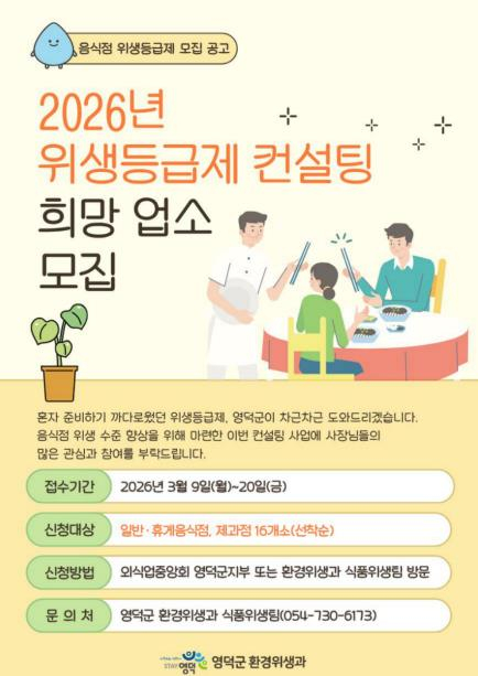영덕군은 지역 음식점의 위생 수준을 높이고 외식 환경의 경쟁력을 강화하기 위해 올해 ‘음식점 위생 등급제 컨설팅’ 사업에 참여 업소를 오는 9일부터 20일까지 선착순으로 모집한다.음식점 위생 등급제란 식약처가 위생 상태를 평가해 매우 우수, 우수, 좋음의 3단계로 등급을 매겨 소비자들이 믿고 찾을 수 있는 지표를 마련하는 제도다. 다만, 평가 항목이 많고 복잡해 일반적인 영업자들이 스스로 준비하기엔 어려움이 많다는 지적이 있어 왔다.이에 영덕군은 이번 사업을 통해 위생 등급 지정을 희망하는 관내 일반·휴게음식점과 제과점 등 16개소를 선정해 전문가의 전문가가 업소를 방문해 위생 상태를 진단하고, 미흡한 부분을 개선할 수 있도록 1:1 맞춤형 기술 지도를 제공한다.또한, 이렇게 향상된 위생 상태를 바탕으로 위생 등급을 받게 되면 이에 맞는 지정 홍보물은 물론, 방역과 위생 물품 등 다양한 혜택도 함께 지원할 예정이다.신청은 영덕군 환경위생과나 한국외식업중앙회 영덕군지부를 방문 접수하면 된다.비용은 위생 컨설팅부터 까다로운 온라인 등급 신청 절차까지 전 과정이 무료다.김신규 환경위생과장은 “위생 등급제는 업소의 청결함을 공인받아 손님들에게 신뢰를 얻고 매출을 올릴 수 있는 좋은 기회”라며, “믿을 수 있는 전문가의 도움을 통해 가게의 경쟁력을 높이고 싶은 사장님들의 많은 참여를 바란다”라고 전했다.