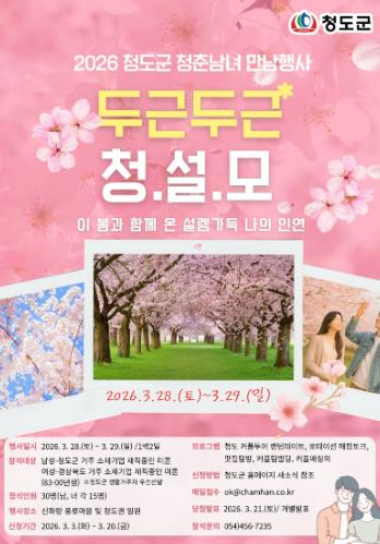 경북 청도군은 다가오는 봄을 맞아 바쁜 직장 생활로 인연을 만날 기회가 부족했던 청년들을 위해, 아름다운 청도 관광 명소를 여행하며 자연스럽게 인연을 찾는 미혼남녀 만남행사‘청(도)설(렘)모(임) 프로젝트’를 개최하고 참가자를 모집한다고 밝혔다.오는 3월 28일부터 29일까지 1박 2일간 진행되는 이번 행사는 청도군의 힐링 명소인‘신화랑 풍류마을’을 비롯한 청도군 일원에서 진행된다.이번 행사의 핵심은‘만남을 행사장 안에서만 끝내지 않고, 청도의 공간과 동선을 따라 함께 경험하는 체류형 프로그램으로 설계했다’는 점이다. 단시간 소개팅 형식이 아니라 1박 2일 일정을 통해 자연스럽게 대화가 이어지도록 하고, 서로의 분위기와 호흡을 편안하게 확인할 수 있도록 구성했다.만개한 봄꽃을 배경으로 한 ▲설렘 폭발 랜덤 데이트 ▲서로의 가치관을 깊이 알아보는 로테이션 매칭 토크 ▲자연스러운 스킨십과 협동심을 유발하는 커플 팀빌딩 등 지루할 틈 없는 1박 2일을 보내게 된다. 모집 대상은 1983년생부터 2000년생까지의 미혼남녀 총 30명(남녀 각 15명)이다. 남성은 청도군 거주자 및 소재 기업 재직자, 여성은 경상북도 거주자 및 소재 기업 재직자라면 신청할 수 있어 폭넓은 만남의 기회를 제공한다. (단, 청도군 생활거주자를 우선 선발할 예정이다.)참가 신청은 3월 3일부터 3월 20일까지이며, 청도군 홈페이지‘새소식’을 통해 신청 방법과 제출 서류 등을 확인할 수 있다. 신청은 이메일로 제출하면 되며, 심사를 거친 최종 참가자는 3월 21일 개별 발표된다.김하수 청도군수는 ˝단순한 인구 증가 정책의 일환이 아니라, 우리 지역과 경북에서 열심히 살아가는 청년들에게 `잊지 못할 봄날의 추억과 인연`을 선물한다는 마음으로 이번 행사를 야심 차게 준비했다˝며, ˝따뜻한 봄바람이 부는 청도에서 평생을 함께할 짝을 만나고 싶은 분들의 망설임 없는 지원을 바란다˝고 말했다.