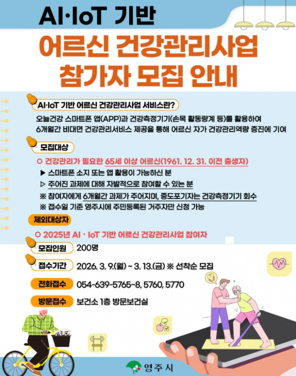 영주시는 오는 3월 9일부터 13일까지 ‘2026년 AI·IoT 어르신 건강관리사업’ 신규 참여자 200명을 선착순 모집한다.AI·IoT 어르신 건강관리사업은 인공지능(AI)과 사물인터넷(IoT) 기술을 활용해 어르신의 건강 상태를 체계적으로 관리하는 프로그램으로, 고혈압·당뇨병 등 만성질환 예방과 건강생활 습관 개선을 지원하기 위해 추진된다.모집 대상은 65세 이상 시민(1961년 12월 31일 이전 출생) 가운데 스마트폰 활용이 가능한 사람이다. 다만 2025년 해당 사업 참여자, 모바일 헬스케어 사업 참여자, 국민건강보험공단 만성질환 관리 자가측정기기 지원 대상자는 제외된다.신청은 영주시보건소 방문보건팀으로 전화하거나 방문해 접수하면 된다.선정된 참여자는 6개월 동안 개인별 건강 상태에 따른 맞춤형 건강관리 서비스를 제공받는다. 손목 활동량계 등 건강측정기기를 지원받아 걸음 수와 활동량 등을 측정하고, 이를 기반으로 월별 건강과제를 수행하게 된다. 또한 전문 인력의 비대면 상담과 건강 코칭을 통해 지속적인 관리도 받을 수 있다.시는 이번 사업을 통해 어르신들이 첨단기술을 활용해 일상 속에서 건강을 스스로 관리하는 습관을 형성하고, 건강하고 활기찬 노후를 보낼 수 있도록 지원할 방침이다.류정희 건강증진과장은 “AI·IoT 어르신 건강관리사업은 어르신들이 첨단기술을 활용해 자신의 건강을 보다 체계적으로 관리할 수 있도록 돕는 사업”이라며 “앞으로도 디지털 기반 건강관리 서비스를 지속적으로 확대해 건강하고 활기찬 노후생활을 지원하겠다”고 말했다.한편, 영주시는 2024년부터 2025년까지 총 396명이 해당 사업에 참여하는 등 AI·IoT 기반 어르신 건강관리사업을 꾸준히 운영해왔다. 시는 그간의 운영 성과를 바탕으로 사업 내실을 더욱 다져 어르신들의 자가 건강관리 역량을 지속적으로 높여 나갈 계획이다.