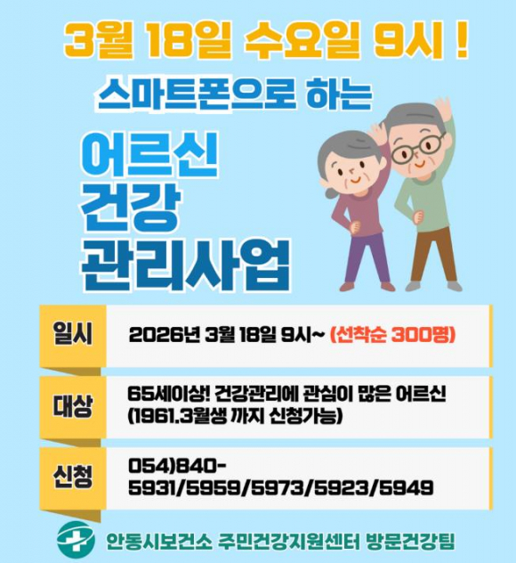 안동시는 3월 18일부터 지역 내 65세 이상 어르신을 대상으로 AI-IoT기반 어르신 건강관리사업 참여자를 모집한다.이번 사업은 어르신의 자가 건강관리 능력 향상을 위해 추진되는 사업으로, 허약․만성질환 관리가 필요하거나 건강행태 개선이 필요한 65세 이상 어르신 300명을 선착순으로 모집한다. 참여를 위해서는 스마트폰을 소지하고 앱(App) 활용이 가능해야 한다.다만 노인장기요양등급 1~3등급 판정자, 보건소 모바일헬스케어 참여자, 국민건강보험공단 만성질환 관리 자가측정기기 지원 대상자와 지난해 참여자는 신청 대상에서 제외된다.대상자로 선정되면 건강 면접조사에 따른 개인의 건강 상태에 따라 손목 활동량계, 혈압계, 혈당계를 지원받고, 6개월간 스마트폰 ‘오늘건강’ 앱을 통해 기록된 건강 상태에 따라 보건소 전문인력이 모니터링 및 맞춤형 건강 컨설팅을 제공한다.참여는 안동시보건소 주민건강지원센터 방문건강팀으로 전화하거나 방문해 신청하면 된다.안동시 관계자는 “스마트 기기와 앱을 활용한 건강관리 서비스를 통해 어르신들이 스스로 만성질환을 관리하고 건강한 생활습관을 형성하는 데 도움이 될 것으로 기대한다”며 “많은 관심과 참여를 바란다”고 전했다.