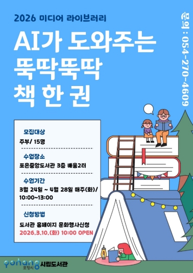 포항시립포은중앙도서관은 오는 24일부터 4월 28일까지 매주 화요일, 포은중앙도서관 배움2터에서 ‘2026 상반기 별찌인문교실’과 ‘미디어라이브러리’ 수업을 운영한다. ‘별찌인문교실 : 나를 찾아가는 여행’은 낮 시간대 프로그램 참여가 어려운 직장인들을 위해 마련된 야간 취미·교양 수업이다. 총 6주간 진행되는 이번 프로그램은 예술 심리를 중심으로 미술, 영화, 사진, 문학, 음악 등 다양한 장르를 접목해 자신의 내면을 돌아보고 이해하는 시간을 제공할 예정이다. 주부들을 대상으로 하는 ‘미디어라이브러리 : AI가 도와주는 뚝딱뚝딱 책 한 권’은 최신 IT 트렌드를 반영한 실습형 프로그램이다. 수강생들은 챗GPT를 활용해 책 기획부터 원고 작성, 교정, 편집, 교지 구성, POD 출간까지 전 과정을 직접 체험하게 된다. 평소 자신의 이야기를 책으로 펴내고 싶었던 이들에게 실질적인 도움이 될 것으로 기대된다. 이번 상반기 프로그램 신청은 10일 오전 10시부터 포항시립도서관 홈페이지 문화행사신청 코너를 통해 선착순으로 진행된다. 자세한 사항은 홈페이지 및 포은중앙도서관 사서팀으로 문의하면 된다.