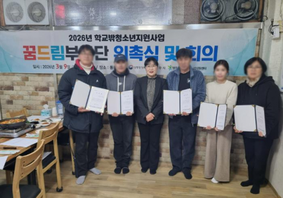 영주시학교밖청소년지원센터는 지난 9일 ‘2026년 제4기 꿈드림부모단 위촉식’을 개최했다.이날 위촉식에는 부모단 7명과 센터 관계자들이 참석한 가운데 위촉장 수여식이 진행됐으며, 학교 밖 청소년 지원사업의 추진 현황과 주요 성과를 공유하고 부모들의 다양한 의견을 나누는 시간을 가졌다.꿈드림부모단은 영주시에 거주하는 학교 밖 청소년의 부모들로 구성된 참여 조직으로, 월 2회 정기 모임을 통해 청소년 지원 방향과 개선 과제를 논의하고 정책 제안, 프로그램 모니터링, 자녀 소통 교육 참여 등 다양한 활동을 펼칠 예정이다.또한 부모단은 현장의 목소리를 센터 운영에 반영하는 가교 역할을 하며, 학교 밖 청소년들이 겪는 어려움을 이해하고 실질적인 지원 방안을 함께 모색하는 협력 파트너로 활동하게 된다.앞서 활동한 제3기 꿈드림부모단은 꿈드림공부방의 학습 공간 부족 문제를 지속적으로 제기하며 개선을 건의했고, 여성가족부 주관 ‘2025년 학교 밖 청소년 전용공간 조성’ 공모사업에 선정돼 국비 7천만 원을 확보했다. 여기에 시비 3억 원을 포함한 총 3억 7천만 원을 투입해 지난해 12월 말 전용 공간 이전을 완료했다.현재 청소년들은 보다 넓고 안정적인 전용 공간에서 학습에 참여하며, 학습지원단 교사들과 함께 체계적인 학습지원을 받고 있다.제4기 꿈드림부모단 역시 이러한 환경 개선 성과를 바탕으로 청소년들이 더 나은 환경에서 성장할 수 있도록 센터와 긴밀히 협력해 나갈 계획이다.정경숙 소장은 “학교 밖 청소년을 가장 가까이에서 지켜보는 부모님의 역할이 매우 중요하다”며 “센터는 부모님들과 긴밀히 협력해 청소년들이 건강하게 성장할 수 있도록 적극 지원하겠다”고 말했다.
