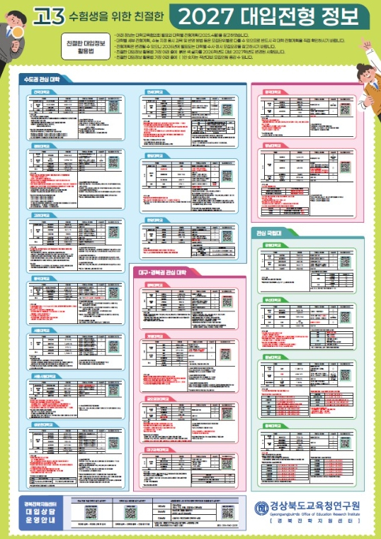 경북교육청은 자체 제작한 ‘2027학년도 대입 대비 진학자료 6종’을 3월 중 도내 전체 고등학교에 보급한다고 11일 밝혔다. 이번 진학자료는 경상북도교육청연구원 경북진학지원센터가 현장 교사들과 함께 개발한 것으로, 교사용 자료와 학생용 자료로 구성됐다. 먼저 교사용 자료는 ‘2027 대입 설명회용 PPT’와 ‘2026 수시 합불 검색 프로그램 및 진학 상담 프로그램’이다. ‘2027 대입 설명회용 PPT’는 2027학년도 대학 입학 전형 경향과 주요 대학 입시 정보를 담고 있으며, 각 학교 상황에 맞게 수정․편집이 가능하도록 제작돼 학교 현장에서 활용도를 높였다. ‘2026 수시 합불 검색 프로그램 및 진학 상담 프로그램’은 최근 3년간 도내 고교의 실제 합격․불합격 사례를 데이터화해 교사들의 진학 상담 전문성을 높일 수 있도록 구성됐다. 학생들을 위해서는 △‘대입 정보 포스터 4종’ △‘2026학년도 대입 정보 달력’ △‘2026 대입 학생부종합전형 합격 사례집’△‘2027 대학 진학 정보’ 등을 제작했다. ‘대입 정보 포스터 4종’은 1학년 학생들을 위한 ‘진로 진학 로드맵’, 2학년 학생들을 위한 ‘2028 대입 정보’, 3학년 학생들을 위한 ‘2027 대입전형 일정표’와 ‘2027 대입전형 정보’ 등 학년별 맞춤형 정보로 구성됐다. ‘2026학년도 대입 정보 달력’에는 올해 주요 대입 일정과 주요 대학 입시 정보, 시기별 대입 준비 사항 등을 한눈에 볼 수 있도록 담았다. 또한 ‘2027 대학 진학 정보’ 동영상은 경상북도교육청 공식 유튜브 채널 ‘맛쿨멋쿨TV’에 탑재해 학생과 학부모가 언제든지 시청할 수 있도록 했다. ‘2026 대입 학생부종합전형 합격 사례집’에는 도내 합격생들의 실제 사례가 담겼다. 대학과 전공별 교과 성적, 과목 이수 현황, 학교생활 주요 활동 등을 소개했으며, 74개 대학 500여 개 사례를 수록해 수험생들에게 실질적인 진학 정보를 제공한다. 교사용 자료는 교사라면 누구나 ‘경북진학지원센터’ 교사 자료실에서 내려받아 활용할 수 있으며, 학생용 자료는 도내 모든 고등학교에 배포될 예정이다. 임종식 교육감은 “2027학년도 대입 대비 진학자료 6종은 교사의 진학 지도 역량을 높이고, 학생과 학부모에게 정확한 대입 정보를 제공하는 데 큰 도움이 될 것”이라며, “앞으로도 학생들이 체계적으로 진로와 진학을 준비할 수 있도록 다양한 지원을 이어가겠다”라고 말했다.