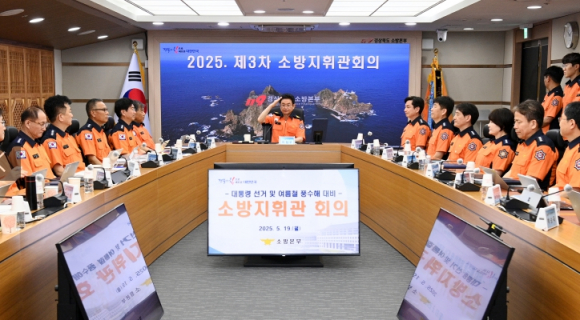 경상북도는 19일 도청 7층 119작전회의실에서 이철우 도지사 주재로 ‘2025년 제3차 소방지휘관회의’를 개최했다.이번 회의에는 소방본부장과 도내 22개 소방서장 등 30여 명의 소방지휘관이 참석해, 오는 6월 3일 실시되는 대통령선거의 안전한 진행을 위한 소방안전대책 추진상황을 점검하고, 여름철 태풍·호우 등 기상재해 및 풍수해에 대한 선제적 대응 전략을 논의했다.특히, 투·개표소 등 주요 시설물에 대한 화재예방과 비상대응태세를 철저히 점검하고, 여름철 태풍·호우 등 자연재난에 대비하여 도민의 생명과 재산 보호를 위한 신속한 대응체계를 준비하였다.회의에 앞서, 2024년도 소방행정종합평가 및 겨울철 화재안전대책 추진 우수 7개 소방서에 대해 시상을 진행하고 축하하였으며, 지난 3월 발생한 초대형 산불 현장에서 최선을 다한 소방공무원과 의용소방대원들의 노고를 격려하고 감사를 전했다.이철우 도지사는 ˝국가적 행사인 대통령선거와 더불어 여름철 재난 발생에 대비해 한 치의 빈틈없는 대응태세를 유지해 달라˝며,˝도민의 생명과 안전이 최우선인 만큼, 현장 중심의 신속하고 적극적인 대응체계를 갖출 것˝을 당부했다.