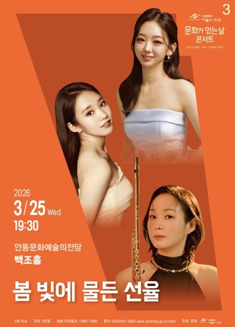 안동문화예술의전당은 매월 마지막 주 수요일 ‘문화가 있는 날’을 맞아 온 가족이 함께 즐길 수 있는 공연을 운영하고 있다. 올해 첫 무대로 마련된 ‘봄빛에 물든 선율’이 오는 3월 25일 오후 7시 30분, 안동문화예술의전당 백조홀에서 열린다.이번 공연은 봄의 시작을 알리는 따뜻한 감성을 담아 하프와 플루트의 맑고 섬세한 음색이 어우러진 무대로 꾸며진다. 국내외에서 활동 중인 자매 하피스트 황리하․황세희로 구성된 ‘하프시스(Harpsis)’와 플루티스트 이예린이 함께 무대에 올라, 봄바람처럼 부드러운 선율로 관객들에게 깊은 울림을 전할 예정이다.프로그램은 차이코프스키의 `호두까기 인형` 중 ‘꽃의 왈츠’를 시작으로, 드뷔시의 `작은 모음곡` 중 ‘조각배’, 피아졸라의 `탱고의 역사` 중 ‘보르델 1900’ 등 클래식 명곡과 이국적인 탱고 음악까지 폭넓게 구성된다. 하프와 플루트의 조합을 통해 익숙한 곡들을 새로운 색채로 재해석해 색다른 음악적 경험을 선사한다.안동문화예술의전당 관계자는 “이번 공연이 봄의 따뜻한 분위기 속에서 클래식 음악을 통해 일상 속 여유와 감동을 느낄 수 있는 시간이 되길 바란다”고 전했다.