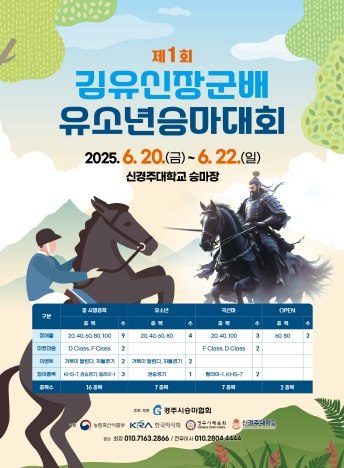 경주시 최초 전국 규모 승마대회인 ‘제1회 김유신장군배 유소년 승마대회’가 다음달 20일부터 22일까지 사흘간 신경주대 승마장에서 열린다.이번 대회는 경주시승마협회(회장 박금란)가 농림축산식품부의 ‘전략적 승마 활성화 지원사업’ 공모에 선정되며 유치에 성공한 것으로, 지역 승마 문화에 새로운 계기가 될 것으로 평가된다.경주시승마협회가 주최하고 농림축산식품부·한국마사회·경주시체육회·신경주대가 후원하는 이번 대회는 총상금 1,360만 원 규모로 치러진다. 유소년 승마 인재의 육성과 더불어 승마의 대중화를 목표로 하고 있다.경기 종목은 △권승경기 △허들경기 △기승인증제 등 초보자도 참가할 수 있는 이벤트 경기부터 △마장마술(F/D 클래스) △장애물(20~100 클래스) 등 정식 종목까지 다양하게 구성돼 있다. 이를 통해 유소년은 물론 성인 승마인까지 폭넓은 참여가 가능하다.또한 이번 대회는 가족 단위 관람객과 일반 시민들에게도 승마의 매력을 체험할 수 있는 기회를 제공할 예정이다.박금란 경주시승마협회 회장은 “그동안 학생 체험 승마, 재활 승마 등 다양한 프로그램을 통해 아동·청소년과 사회적 약자에게 승마 교육 기회를 넓혀왔다”며 “이번 대회는 그 노력의 결실로, 유소년들이 화랑정신을 계승하고 경주시 승마문화 발전에도 크게 이바지하는 뜻깊은 행사가 될 것”이라고 강조했다.