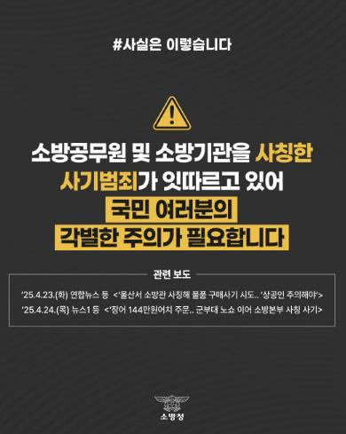 울진소방서는 최근 소방관을 사칭한 사기범죄가 발생함에 따라 시민들에게 각별한 주의를 당부했다. 지난 7일 충남 천안서북소방서는 한 실내 인테리어 업자로부터 ˝서북소방서 직원이 대리결제를 요청했다˝는 신고를 접수했다. 신고 에 따르면, 용의자는 자신을 소방관이라고 속이며 5천500만 원 상당의 방화복을 대리구매해달라고 요청했다. 이 과정에서 실제 소방관의 이름이 적힌 명함을 건넸다고 한다. 그러나 소방 당국의 조사 결과, 해당 소방관은 대리구매를 요청한 적이 없었다.또한, 지난 19일에는 금호타이어 광주공장 화재를 진압 중인 소방관을 사칭한 사기행각으로 인해 남구 한 음식점 업주가 20여만원 상당 피해를 봤다는 신고가 접수됐다. 업주 A씨는 “소방관을 위한 음식이라며 저렴한 가격으로 주문을 받았지만, 정작 주문자는 나타나지 않았다”고 전했다. 경찰은 공무원을 사칭한 사기 수법이 자영업자를 대상으로 성행하고 있다며 각별히 주의해야 한다고 강조했다.서창범 울진소방서장은 ˝전국 모든 소방기관은 어떠한 경우에도 시민을 대상으로 금품을 요구하거나 개인 명의로 물품을 요청하지 않는다˝며 경각심을 높였다.그는 또한 ˝조금이라도 의심스러운 경우 즉시 관할 소방서에 연락해 달라˝고 강조했다. 이러한 사기범죄는 시민들의 안전을 위협할 수 있는 중대한 문제로, 각별한 주의가 필요하다. 소방관을 사칭한 범죄는 단순한 사기가 아니라, 공공의 신뢰를 저해하는 행위로 간주되어야 한다.소방관들은 시민의 안전을 지키기 위해 헌신하고 있으며, 이들의 신뢰를 훼손하는 행위는 결코 용납될 수 없다. 시민들은 소방관의 요청이 의심스러울 경우, 반드시 확인 절차를 거쳐야 한다.