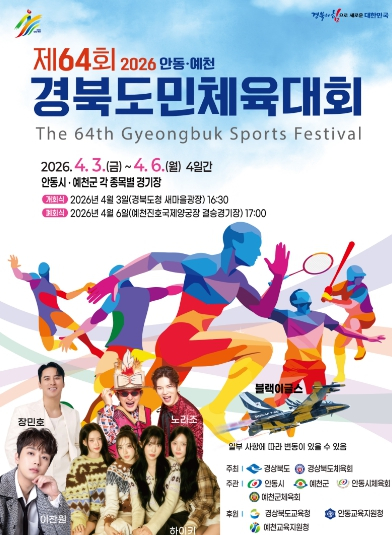 경상북도는 4월 3일 오후 4시 30분, 경북도청 새마을광장에서 ‘함께 여는 화합체전, 미래 여는 경북도민’을 슬로건으로 제64회 경북도민체육대회 개회식을 열고 4일간의 열전에 돌입한다.이번 대회에는 도내 22개 시·군 선수단과 임원 등 1만 2,000여 명이 참가하며, 관람객을 포함해 총 3만 2,000여 명이 함께 할 예정이다. 특히 이번 체전은 도민체전 사상 최초로 안동시와 예천군이 공동 개최해 시·군 간의 경계를 넘어선 화합과 상생의 의미를 더했다. 선수들은 시부 30개, 군부 16개 종목에서 각 지역의 명예를 걸고 선의의 경쟁을 펼친다. 안동시와 예천군이 힘을 모아 준비한 만큼 북부권 거점 도시 간 상생 협력의 새로운 본보기를 보여줄 것으로 전망된다.개회식은 경북의 자부심을 고취하고 도민의 기운을 하나로 모으는 다채로운 프로그램으로 구성된다. 식전 행사에서는 인기 그룹 ‘노라조’공연과 안동의 대표적 전통문화인 ‘차전놀이’가 펼쳐져 축제 분위기를 고조시킨다. 이어 대한민국 공군 특수비행팀 ‘블랙이글스’ 8대가 선보이는 에어쇼가 경북도청 신도시의 상공을 수놓으며 대회의 시작을 알린다. 공식 행사는 22개 시·군 선수단 입장을 시작으로 개회 선언, 환영사, 대회기 게양, 대회사, 선수단 대표 선서 순으로 진행된다. 선수단은 울릉군을 시작으로 각 시·군의 특색을 담은 장기(퍼포먼스)와 함께 입장하며, 개최지인 안동시와 예천군 선수단이 마지막으로 입장할 때 관중석의 환호는 정점에 달할 것으로 보인다. 이번 개회식은 지역 방송사(TBC)를 통해 생중계되어 현장의 뜨거운 감동을 도내 전역에 생생하게 전달할 계획이다.대회의 주요 장면인 성화 점화는 경북을 빛낸 체육인들이 참여하여 대회의 품격을 높인다. 2023 항저우 아시안게임 은메달리스트 박민정 선수와 2025 아시아육상 금메달리스트 나마디 조엘진 선수가 최종 주자로 나서 성화대에 불꽃을 피워 올린다. 성화 점화와 동시에 밤하늘을 수놓는 500여 대의 첨단 무인기 공연(드론쇼)은 경북의 혁신적인 기술력을 보여주며, 성공적인 대회 개최를 기원하는 화려한 장관을 연출한다.식후 공연에는 이찬원, 장민호, 하이키 등 국내 정상급 가수가 출연하여 모든 세대가 함께 즐기는 화합의 무대를 선사한다. 경상북도는 이번 제64회 경북도민체육대회가 도민의 저력을 확인하고 경북 북부권의 새로운 미래를 설계하는 화합의 장이 될 것으로 기대하고 있다. 또한, 경상북도는 도민이 안심하고 축제를 즐길 수 있도록 안전 관리에도 만전을 기했다. 개회식장에 설치된 대규모 객석 시설물과 수중 화면(워터스크린) 등 주요 구조물에 대해 철저한 구조안전진단을 실시했으며, 지난 4월 1일에는 안동시와 합동점검을 통해 현장 전반의 안전성을 최종 확인했다. 황명석 경상북도지사 권한대행은“이번 대회는 도민체전 역사상 첫 공동 개최를 통해 도민이 하나로 마음을 모으는 뜻깊은 자리”라며, “대회 기간 동안 최선을 다해 줄 선수단과 운영을 위해 힘써준 안동시·예천군 관계자, 그리고 성원을 보내준 도민 여러분께 깊이 감사드린다”라고 밝혔다.