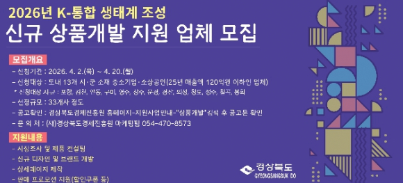 경상북도는 도내 유망 중소기업·소상공인의 제품 경쟁력 강화를 위해 ‘2026년 K-통합 마케팅 생태계 조성사업’의 일환으로 상품 기획부터 디자인·마케팅까지 전 과정을 지원하는‘신규 상품개발 지원사업’에 참여할 기업을 모집한다.이번 사업은 도내 13개 시·군(포항, 김천, 안동, 구미, 영주, 상주, 문경, 경산, 의성, 청도, 성주, 칠곡, 봉화)에 소재한 중소기업‧소상공인을 대상으로 하며, 2025년 기준 매출액 120억 원 이하 기업이면 신청할 수 있다. 상품화 전 과정을 아우르는‘풀패키지’지원선정된 기업(33개사 내외)에는 신규 상품이 시장에 성공적으로 안착할 수 있도록 상품화 전 단계에 걸친 맞춤형 지원이 제공된다. 주요 지원 내용은 다음과 같다. 상품개발 : 시장조사, 제품 컨설팅, 디자인 및 브랜드 개발 콘텐츠 제작 : 온라인 판매용 상세페이지 제작 판촉지원 : 할인쿠폰 지원 등 판매 프로모션 지원 4월 2일부터 20일까지 접수(경상북도경제진흥원 홈페이지에서 확인)신청 기간은 2026년 4월 2일(목)부터 4월 20일(월)까지이다. 참가를 희망하는 기업은 경상북도경제진흥원 홈페이지 내‘지원사업안내’메뉴에서‘상품개발’을 검색해 공고문을 확인한 후 신청하면 된다.본 사업과 관련한 문의는 (재)경상북도경제진흥원 마케팅팀으로 하면 된다.이재훈 경상북도 경제통상국장은“이번 사업은 단순한 일회성 지원이 아니라, 도내 중소기업과 소상공인이 시장에서 스스로 살아남을 수 있는‘강한 기초체력’을 기르는 것이 이번 사업의 핵심이다”며“기획부터 마케팅까지 전 과정을 지원해 경북제품이 국내를 넘어 글로벌 시장에서도 경쟁력을 갖출 수 있도록 적극 지원하겠다”고 말했다.한편, 경북도는 시군 공동(총 15개 시군 참여)으로 K-통합 마케팅 생태계 조성사업을 신설해 이번 신규 상품개발 사업 외에도 ▲맞춤형 마케팅 패키지(온라인 광고, 콘텐츠 제작 등) ▲오프라인 특판전 지원사업을 추진하여, 지역 기업의 판로 역량을 한층 더 끌어올릴 계획이다.