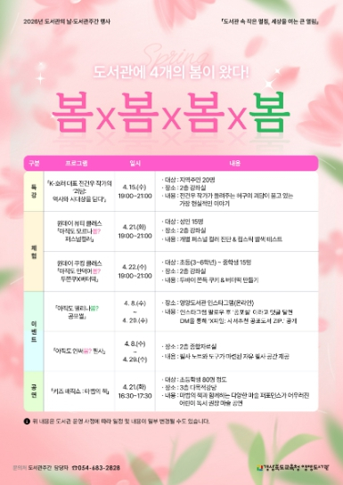 경상북도교육청 영양도서관은 2026년 도서관의 날·도서관주간을 맞아 ‘도서관 속 작은 펼침, 세상을 여는 큰 열림’을 공식 표어로 지역주민을 위한 강연, 체험, 공연, 이벤트를 운영한다. 이번 행사로 ▲15일 전건우 작가의 ‘괴담: 역사와 시대상을 담다’▲21일 ‘원데이 뷰티 클래스: 아직도 모르나봄? 퍼스널 컬러’▲21일 ‘키즈 매직쇼: 마법의 책’▲22일 ‘원데이 키즈 쿠킹 클래스: 아직도 안먹어봄? 두쫀쿠X버터떡’프로그램을 마련했다. 이와 함께 ▲8일부터 29일까지 인스타그램을 활용한 온라인 이벤트 ‘아직도 떨리나봄? 공포썰’과 2층 종합자료실 내 자유 필사 공간을 제공하는 이벤트 ‘아직도 안써봄? 필사’를 통해 지역주민의 참여를 독려할 예정이다. 우승희 관장은 “도서관주간을 맞아 지역주민들이 도서관에서 다양한 문화적 경험을 즐기고 도서관이라는 공간을 보다 친근하게 느낄 수 있기를 바란다.”고 밝혔다.