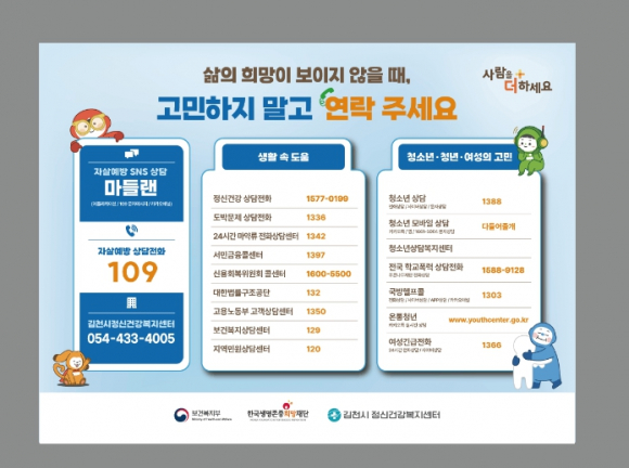 김천시는 자살률이 급증하는 봄철(3월~5월)을 맞아 ‘자살 고위험시기 집중관리 기간’를 추진한다고 밝혔다. 봄철은 계절적 요인과 졸업·채용 시기 등 사회적 요인이 맞물려 전국적으로 자살률이 증가하는 시기이다. 이에 시는 자살 고위험군에 대한 밀착 관리와 대시민 홍보 활동을 통해 생명 존중 문화를 확산시키고 소중한 생명을 보호하는 데 행정력을 집중할 계획이다. 특히, 자살 고위험군 관리 분야에서는 기존 등록 대상자 중 집중 관리가 필요한 인원을 선별하여 안부 전화와 방문 상담 등 맞춤형 사례 관리를 강화한다. 또한, 김천고용복지플러스센터와 ㈜대신정보통신과의 MOU를 통해 정신건강 위험군의 조기 발견 및 관리를 강화하고 경찰·소방·의료기관 등의 협조를 통해 자살 시도자나 유가족 등 고위험군이 방치되지 않도록 체계적인 지원 체계를 구축했다. 홍보 및 캠페인 분야에서는 유동 인구가 많은 지역에 현수막 게시와 디지털 매체를 활용하고 아파트 관리사무소, 약국, 병원 등 생활 밀착형 기관과 협업하여 마음 건강 포스터 및 리플릿을 배포한다. 시 관계자는 “봄철은 상대적 박탈감이나 우울감이 깊어질 수 있는 시기인 만큼, 이웃에 대한 따뜻한 관심이 무엇보다 중요하다.”라며, “앞으로도 촘촘한 지역사회 인적 안전망을 가동하여 자살 예방 사각지대를 해소하고 시민이 안전한 김천을 만드는 데 최선을 다하겠다.”라고 밝혔다.