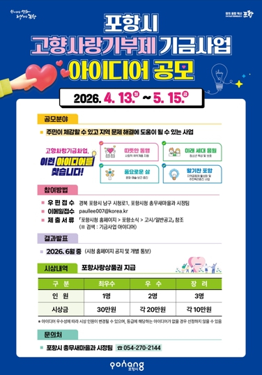 포항시가 기부자의 소중한 마음을 지역의 희망으로 전환하기 위해 ‘2026년 포항시 고향사랑기부제 기금사업 아이디어’를 공개 모집한다.이번 공모는 기부금의 활용 가치를 높이고 주민들이 일상에서 실질적인 변화를 체감할 수 있는 사업을 발굴하기 위해 마련됐다. 특히 기부자의 공감을 이끌어내는 동시에 지역 문제를 시민과 함께 고민하고 해결하려는 취지를 담고 있다.모집 분야는 ▲사회적 취약계층 지원 및 청소년 육성 ▲주민의 문화·예술·보건 증진 ▲지역공동체 활성화 지원 등 기부금법에서 정한 목적에 부합하는 모든 사업을 대상으로 한다.포항시 고향사랑기부제에 관심 있는 사람이라면 누구나 참여할 수 있으며, 공모 기간은 오는 13일부터 내달 15일까지다. 참여 희망자는 포항시청 누리집에 게시된 제안신청서와 동의서를 작성해 이메일이나 우편으로 제출하면 된다. 접수된 아이디어는 사업 적합성, 창의성, 실행 가능성, 효과성 등을 종합적으로 심사해 6월 중 최종 결과를 발표한다. 시상은 최우수(30만 원)를 포함해 최대 6명을 선정할 예정이며, 구체적인 시상 인원과 등급은 제안의 우수성 및 심사 결과에 따라 결정된다.박재관 자치행정국장은 “단순한 기부를 넘어 기부자가 보람과 자부심을 느끼고, 모든 시민이 혜택을 체감할 수 있는 포항만의 참신한 아이디어가 많이 제안되길 기대한다”며, “고향사랑기부제로 조성된 재원이 지역 복지 증진과 공동체 회복을 위해 가장 필요한 곳에 투명하게 쓰일 수 있도록 운용 과정을 철저히 관리하겠다”고 덧붙였다.한편, 고향사랑기부제는 개인이 자신의 주소지를 제외한 지자체에 기부하면 연말정산 세액공제와 함께 기부금의 30%에 해당하는 답례품 혜택을 받는 제도다. 10만 원 기부 시 전액 세액공제와 3만 원 상당의 답례품을 받아 총 13만 원의 혜택을 누릴 수 있으며, 20만 원 기부 시에는 14만 원의 세액공제와 6만 원 상당의 답례품 혜택이 주어진다.포항시는 이번 공모전을 통해 기부금 활용의 투명성을 높이는 동시에, 시민들의 창의적인 아이디어를 시정 곳곳에 반영하여 주민들이 실질적으로 체감할 수 있는 혁신 사업 추진에 행정력을 집중할 방침이다.