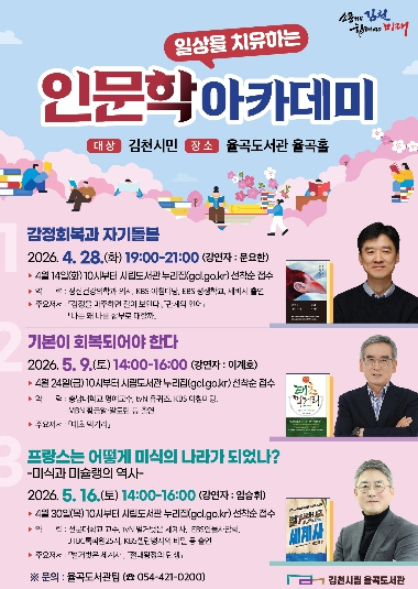 김천시립율곡도서관(관장 이신기)은 시민들의 정서적 회복과 인문학적 소양 함양을 위해 오는 4월 28일부터 `일상을 치유하는 인문학 아카데미`를 운영하고 참가자를 모집한다고 밝혔다. 이번 프로그램은 감정, 건강, 음식문화 등 우리 일상과 밀접한 주제를 중심으로 기획됐으며, 시민들이 실질적으로 공감하고 삶의 균형을 찾을 수 있도록 돕는 세 개의 강연으로 구성됐다. 첫 번째 강연은 4월 28일 오후 7시, 정신건강의학과 전문의 문요한 의사가 ‘감정회복과 자기돌봄’을 주제로 문을 연다. 일상 속에서 마주하는 다양한 감정을 이해하고 이를 건강하게 회복하는 구체적인 방법을 제시할 예정이며, 참가 신청은 4월 14일부터 접수한다. 두 번째 강연은 5월 9일 오후 2시, 이계호 교수가 ‘기본이 회복되어야 한다’는 주제로 강단에 선다. 건강한 삶을 지탱하는 근본적인 요소와 올바른 생활습관의 중요성을 전달하며, 참가 신청은 4월 24일부터 가능하다. 마지막 세 번째 강연은 5월 16일 오후 2시, 임승휘 교수가 ‘프랑스는 어떻게 미식의 나라가 됐나’를 주제로 음식문화의 역사 속에 담긴 인문학적 통찰을 제공한다. 참가 신청은 4월 30일부터 시작된다. 율곡도서관(관장 이신기)은 “이번 인문학 아카데미가 시민들이 일상에서 자신을 돌아보고 삶의 균형을 찾는 계기가 되기를 바란다.”라며, “많은 시민의 관심과 참여를 기대한다.”라고 밝혔다. 한편, 강연은 율곡도서관 율곡홀에서 진행되며 지역 주민 누구나 참여할 수 있다. 신청은 강연 회차별 일정에 맞춰 김천시립도서관 누리집을 통해 선착순으로 접수하면 된다.
