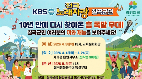 경북 칠곡군은 군민 화합과 소통의 장을 마련하기 위해 온 국민의 사랑을 받는 국민 프로그램 KBS 전국노래자랑‘칠곡군편’을 개최한다. 국민 MC 남희석의 맛깔나는 진행과 함께 박서진, 천록담, 김희재, 정혜린, 미스김 등 최정상급 인기 트로트 가수들이 초대가수로 총출동해 잊지 못할 흥겨운 무대를 선사할 예정이다. 무대에 올라 숨겨둔 끼와 노래 실력을 뽐낼 참가자는 4월 13일부터 24일까지 가까운 읍·면사무소에 방문하여 접수하면 되고, 칠곡군민은 물론 칠곡군에 소재한 사업자, 직장인, 학생이라면 누구나 신청 가능하다. 본선 진출자를 가리기 위한 치열한 예심은 4월 30일 오후 1시 칠곡군 교육문화회관 대공연장에서 열리며, 이 관문을 통과한 15-16팀의 실력자들만이 5월 2일 본선 무대에서 본인들의 숨은 끼를 양껏 발휘할 기회를 얻는다. 본선 녹화는 5월 2일 오후 2시, 아름다운 경관을 자랑하는 ‘칠곡평화분수대 특설무대’에서 화려하게 열린다. 행사 당일 주차장이 혼잡할 수 있으므로 방문객들은 대중교통을 이용 또는 도보로 이동하는 것이 권장된다. 군 관계자는 ˝이번 KBS 전국노래자랑이 칠곡평화분수대의 아름다운 경관을 전국에 알리고, 군민 모두가 일상의 스트레스를 날리며 하나 되는 흥겨운 축제의 장이 되길 바란다.”며“노래와 춤에 소질 있는 군민 여러분의 많은 관심과 적극적인 참여를 부탁드린다.”고 말했다.
