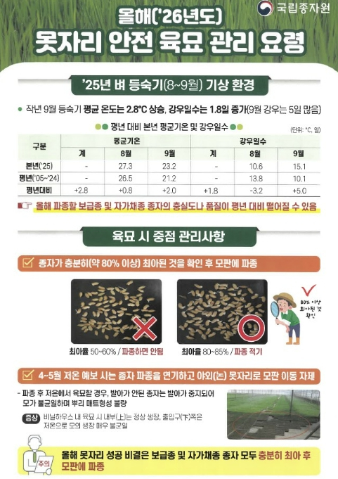 봉화군은 본격적인 벼 농사 시기를 맞아 키다리병, 도열병 등 종자 전염 병해충 예방을 위한 ‘벼 종자소독 및 안전 육묘 관리’ 홍보와 현장 지도에 총력을 기울이고 있다.지난해 9월 등숙기 평균 기온이 평년 대비 2.8℃ 상승하고 강우 일수가 5일 증가하는 등 기상 환경이 좋지 않아 올해 파종할 보급종 및 자가채종 종자의 충실도가 평년보다 떨어질 것으로 예측된다. 이에 철저한 종자 소독과 육묘 관리가 절실한 시점이다.벼 종자소독은 크게 온탕소독과 약제소독으로 나뉜다. 온탕소독은 60℃의 물에 종자를 10분간 담근 후 즉시 찬물에 10분 이상 식혀야 하며, 온도와 시간 미준수 시 발아율이 떨어질 수 있어 각별한 주의가 필요하다. 약제소독은 소독 약액을 30~32℃의 온도로 유지하며 24~48시간 동안 침지해야 효과를 극대화할 수 있다.또한, 종자 개별로 싹을 1~2mm 길이로 충분한 싹을 틔워주고, 발아가 총 80%이상 된 것을 확인 후 파종하여야 안전한 육묘가 이루어질수 있다.신종길 농업기술센터 소장은 “지난해 불량한 기상 여건으로 종자 활력이 떨어질 수 있는 만큼, 철저한 종자 소독과 80% 이상 최아 후 파종하는 것이 올해 농사의 성패를 가를 것”이라며 “지속적인 모니터링을 통해 적기 파종과 안전 육묘가 이루어질 수 있도록 최선을 다하겠다”고 전했다.