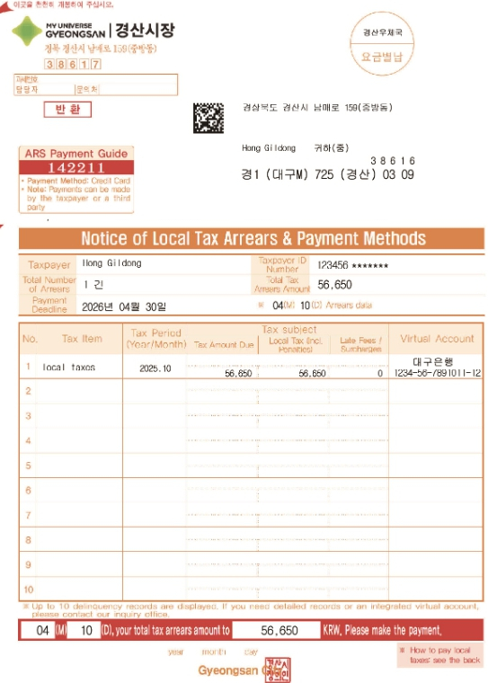 경산시는 지방재정의 건전성을 높이고 공정한 납세 질서를 확립하기 위해 ‘지방세 체납액 일제정리 기간’을 운영하며 체납세 징수에 적극 나서고 있다.이번 일제정리 기간 동안 경산시는 지방세 체납자 18,000여 명(체납액 150억 원), 세외수입 체납자 15,000여 명(체납액 142억 원)을 대상으로 체납세 안내문을 일괄 발송하고 납부를 독려한다.아울러 증가하고 있는 외국인 체납자를 위해 영어, 베트남어, 중국어로 제작된 안내문을 별도로 발송하여 언어 장벽으로 인한 불편을 해소하고 실질적인 납부 참여를 유도할 계획이다.또한 이달 말까지 체납 안내문을 받지 못한 납세자에게는 다음 달 카카오톡 체납 안내문을 발송해 본인 인증과 동시에 즉시 납부할 수 있도록 함으로써, 납부 편의 향상과 체납액 징수율 제고에 힘쓴다.시는 체납세 정리 목표 달성을 위해 전 징수행정력을 동원해 책임 징수 활동과 각종 체납처분 및 행정제재를 추진하는 한편, 중동사태 피해 기업과 생계형 체납자에 대해서는 적극적인 분납 안내와 체납처분 유예 등의 지원 사항을 안내한다.