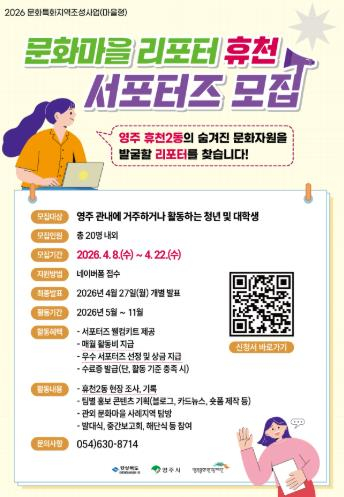 (재)영주문화관광재단은 2026년 문화특화지역조성사업(마을형)의 일환으로 청년 참여형 기록·홍보 프로젝트인 `문화마을리포터 : 휴천` 서포터즈를 모집한다.본 사업은 영주시 휴천2동을 중심으로 지역의 일상과 사람, 공간, 문화를 청년의 시선으로 조사·기록하고, 이를 다양한 홍보 콘텐츠로 제작하는 참여형 프로그램이다. 지역에 대한 이해를 바탕으로 문화적 가치를 발굴하고, 청년이 직접 지역과 관계를 맺으며 문화마을의 가능성을 확산하는 데 목적이 있다.이번 모집은 만 19세 이상 39세 이하 청년을 대상으로 하며, 모집인원은 20명 내외이다. 선발된 참여자는 팀 단위로 활동하며, 5월부터 11월까지 약 7개월간 활동하게 된다.서포터즈는 활동 기간 동안 사업 이해를 위한 기본교육과 실무 경험을 제공받고, 휴천2동 현장 조사와 기록 활동, 팀별 홍보 콘텐츠 기획 및 제작, 관외 문화마을 사례지역 탐방 등 주요 공식 일정을 참여하게 된다.특히 블로그, 카드뉴스, 숏폼 등 다양한 온라인 콘텐츠 제작을 통해 지역 이야기를 보다 친근하고 효과적으로 전달할 예정이다. 참여자에게는 활동에 따른 월별 활동비 지급, 웰컴키트 제공, 수료증 발급, 우수 서포터즈 선정 및 상금 수여 등 다양한 혜택도 제공될 예정이다. 이를 통해 청년들이 지역문화 현장을 직접 경험하고, 문화기획 및 콘텐츠 제작 역량을 키울 수 있을 것으로 기대된다.재단 관계자는 “문화마을리포터 : 휴천은 청년들이 지역의 변화를 직접 보고 기록하며, 지역과 함께 성장할 수 있는 실천형 프로그램”이라며 “문화와 지역에 관심 있는 청년들의 많은 참여를 바란다”고 말했다.`문화마을리포터 : 휴천` 서포터즈 모집과 관련된 사항은 재단 홈페이지를 통해 확인할 수 있으며, 신청 기간은 이달 22일까지이다. 사업과 관련된 문의 사항은 재단 문화예술팀으로 문의하면 된다.